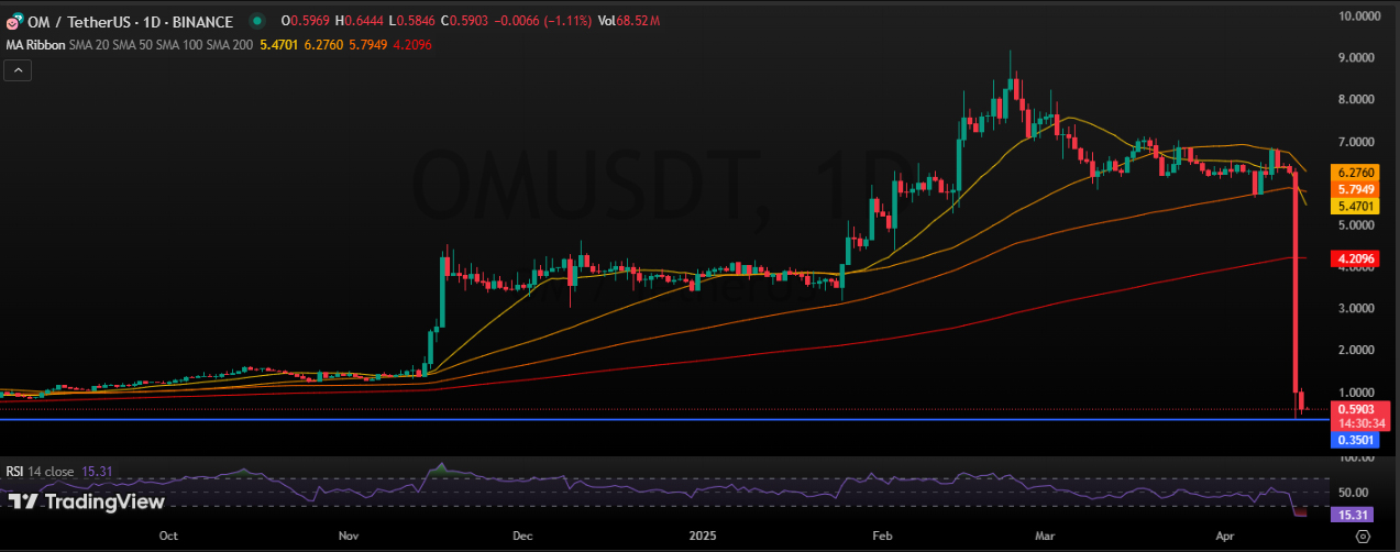 从日线图来看,OM 的价格遭遇了灾难性的下跌。它从 6 刀以上一路跌至 0.6 刀,跌破了各个支撑位,包括 20 日、50 日、100 日,甚至 200 日移动平均线(目前在 4.2 刀附近)。