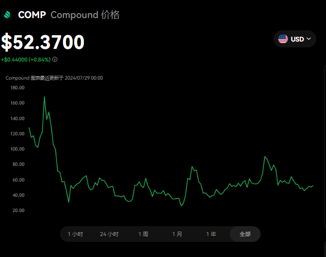 Compound 当前价格为 $52.3700。Compound 的价格在过去 24 小时内上涨了 +0.85%。目前,Compound 市值排名为第 92 名,实时市值为 $4.38亿,流通供应量为 8,360,649 COMP,最大供应量为 10,000,000 COMP。我们会实时更新 Compound/USD 的价格。今日$0.44000+0.84%7 天$2.6500+5.32%30 天$2.8600+5.77%3 个月-$4.7300-8.29%