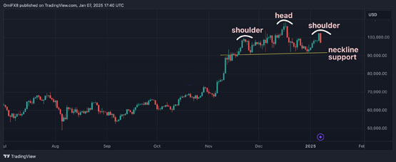 对于这波下跌,CoinDesk 的市场分析师 Omkar Godbole 出来“把脉”了。 他说,从技术分析的角度来看,比特币可能已经进入了一种叫做“头肩顶”的形态。 听起来有点吓人,但简单来说,就是一种潜在的下跌信号。 如果关键支撑位被跌破,可能会引发更大的抛售潮。