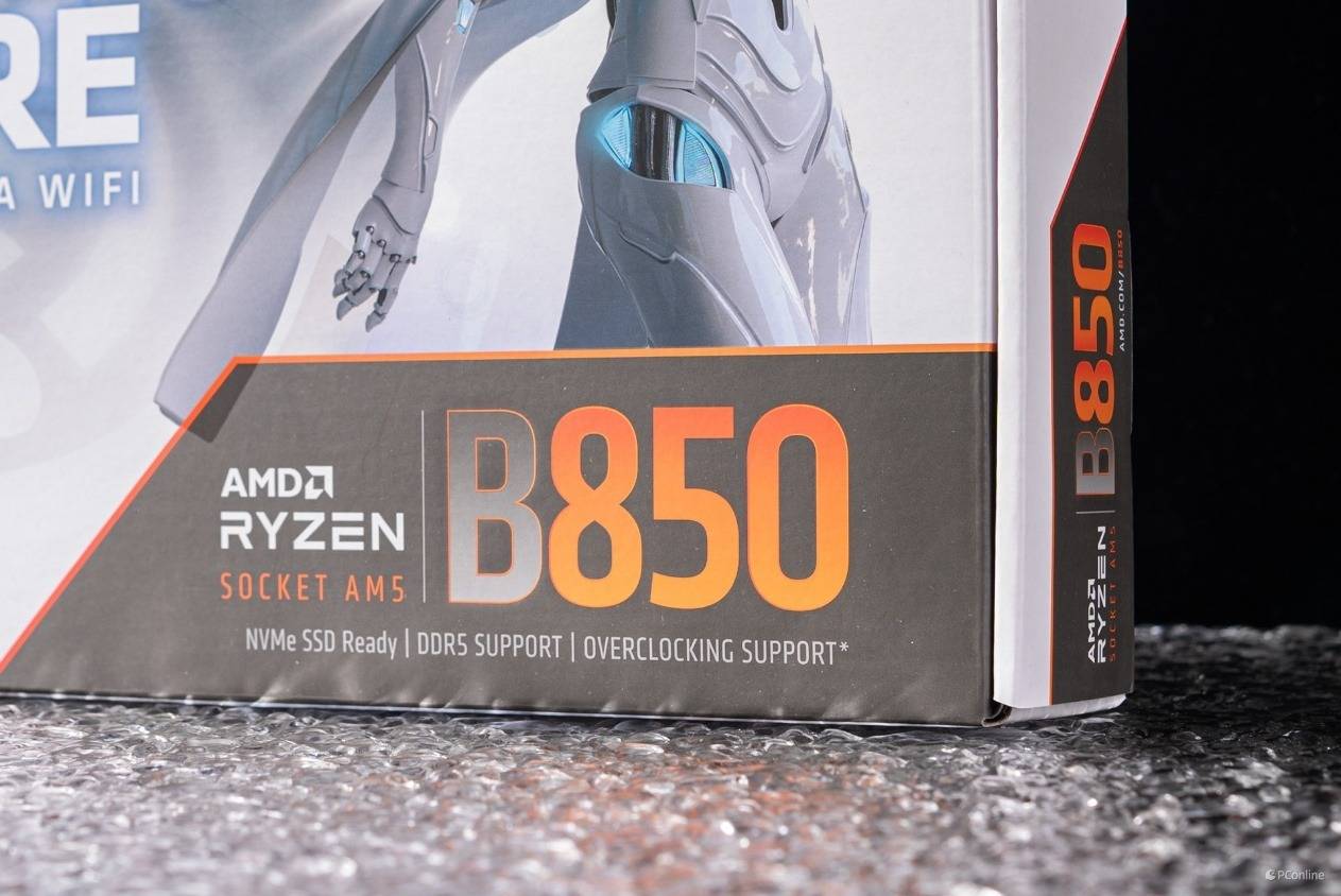 包装盒的右下角则标注了这款主板的芯片组配置,为AMD B850,并且不同于隔壁家的B系列主板,AMD的B系列主板不仅支持内存超频,还支持超频。