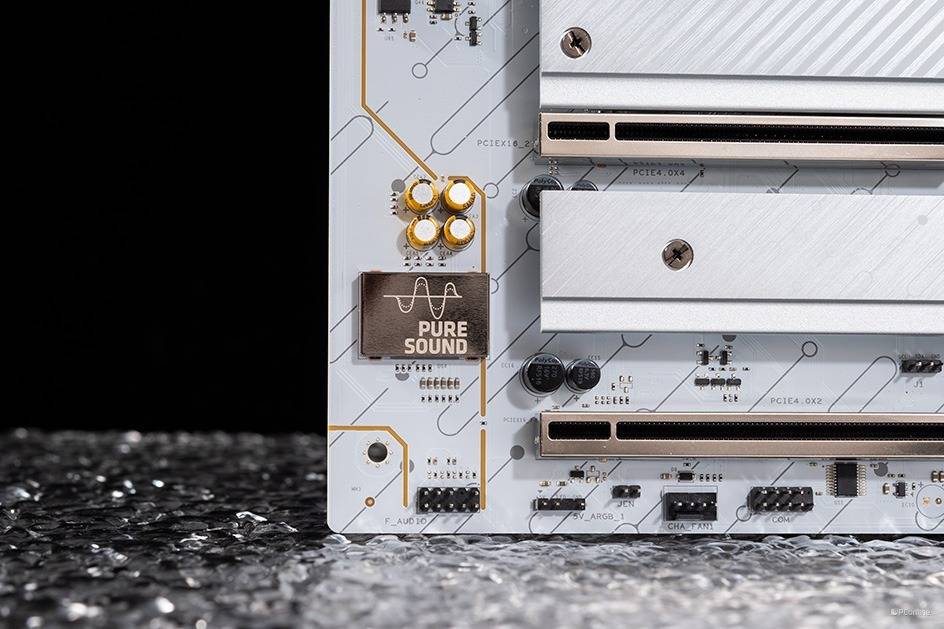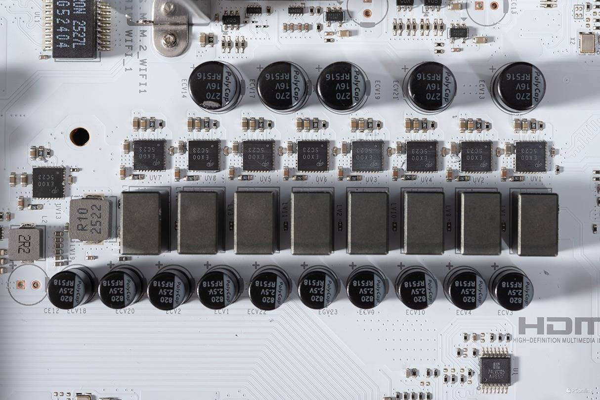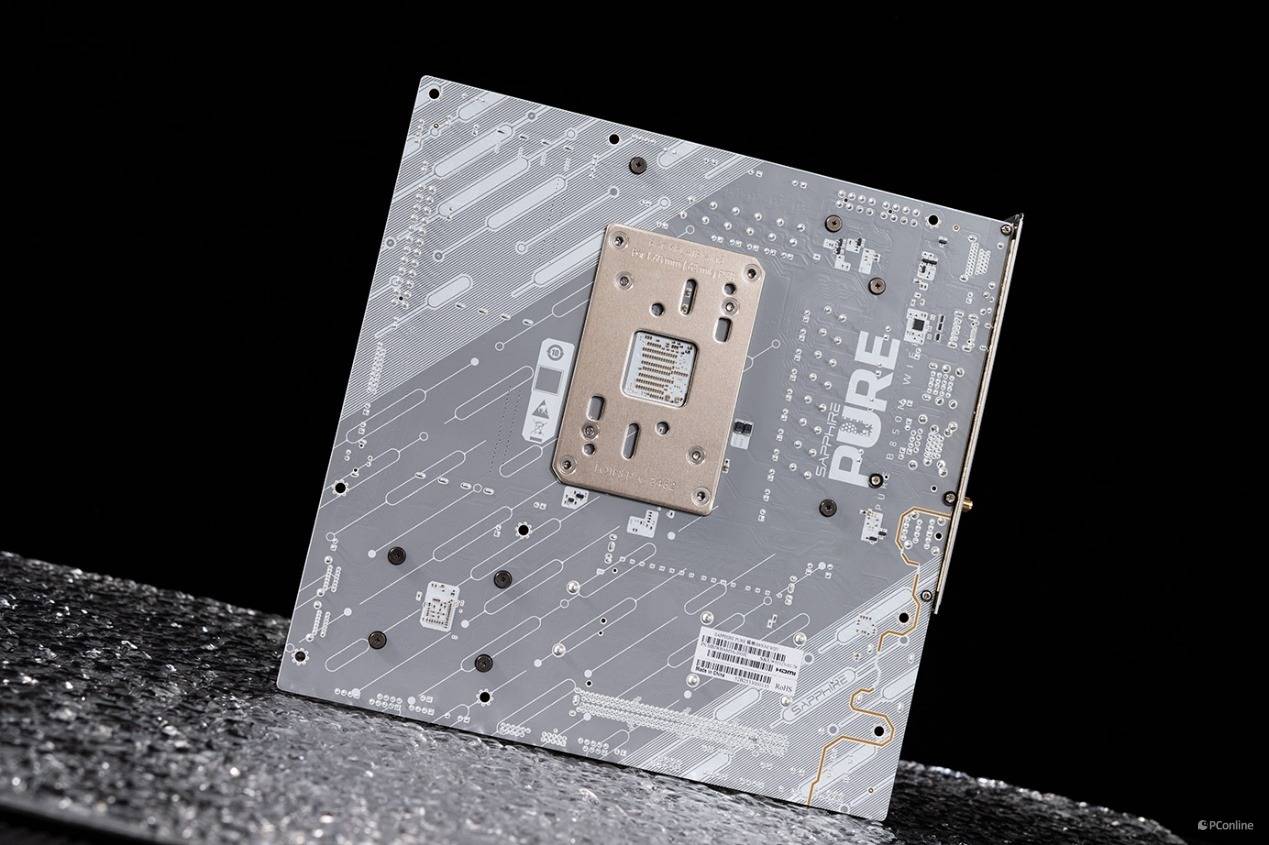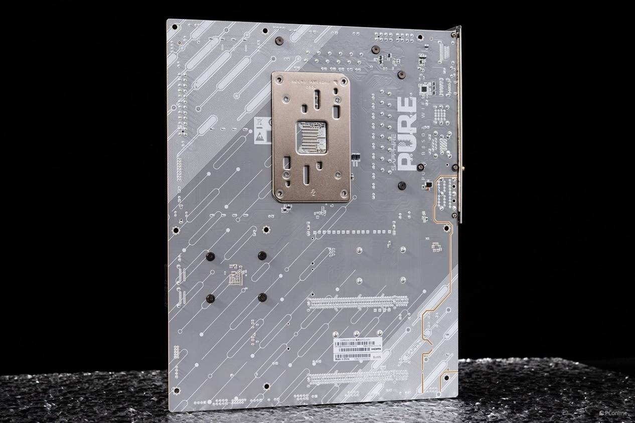 背面也做了白色处理,与正面相得映彰。走线也非常规整,做工同样出色,据介绍,其在内存与PCIe插槽处是采用了成本更高、技术更为先进的SMT贴片工艺,电气性能更佳。