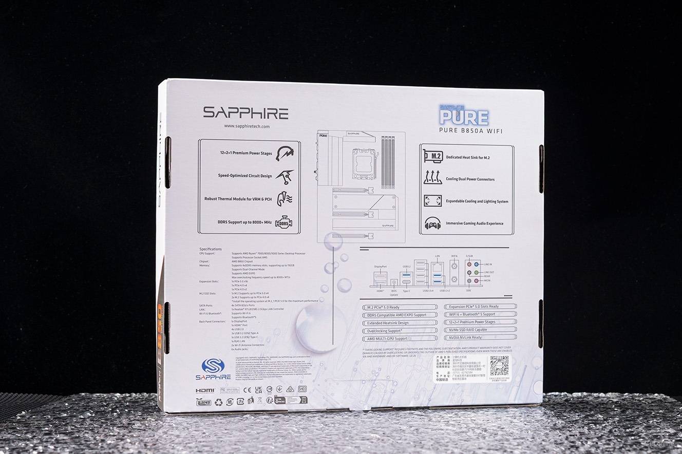 首先让我们先来看这次PURE极地B850系列的老大哥——蓝宝石PURE极地B850A WIFI主板,外包装设计上延续了过往PURE系列的特色,让人一眼就能看出这款主板主打的就是纯白设计,并且正面包装还有PURE系列独有的标识,科技感十足。