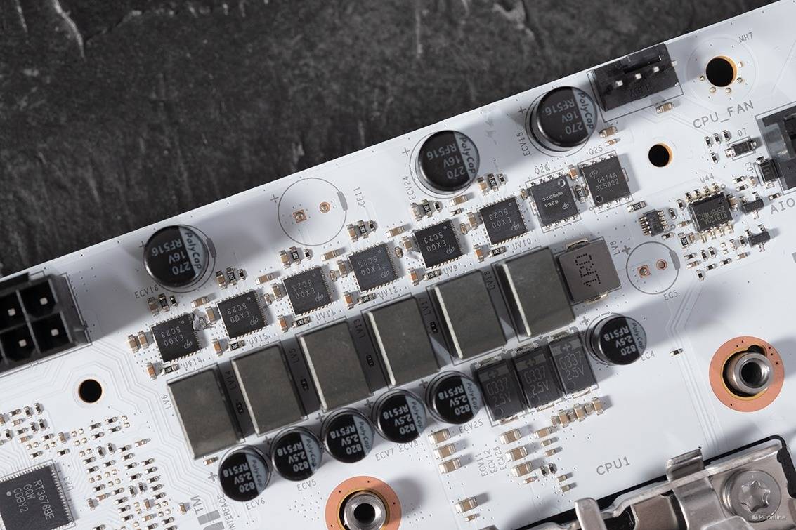 并且散热装甲上在电子元器件覆盖处还有高导热系数的导热垫,能够将电感、DrMos等元件的热量快速导出。