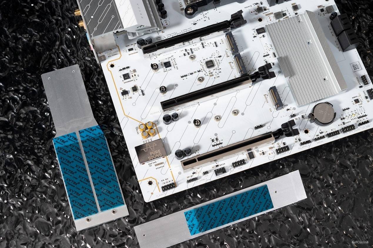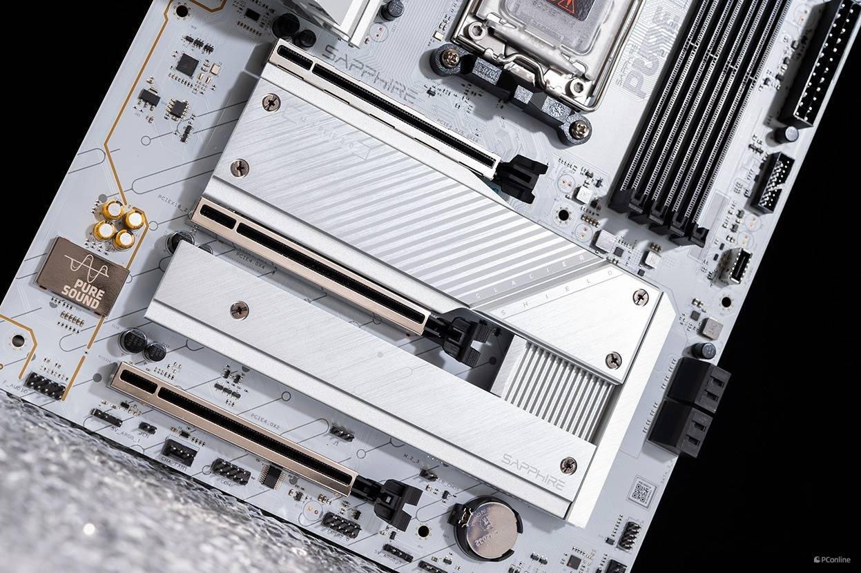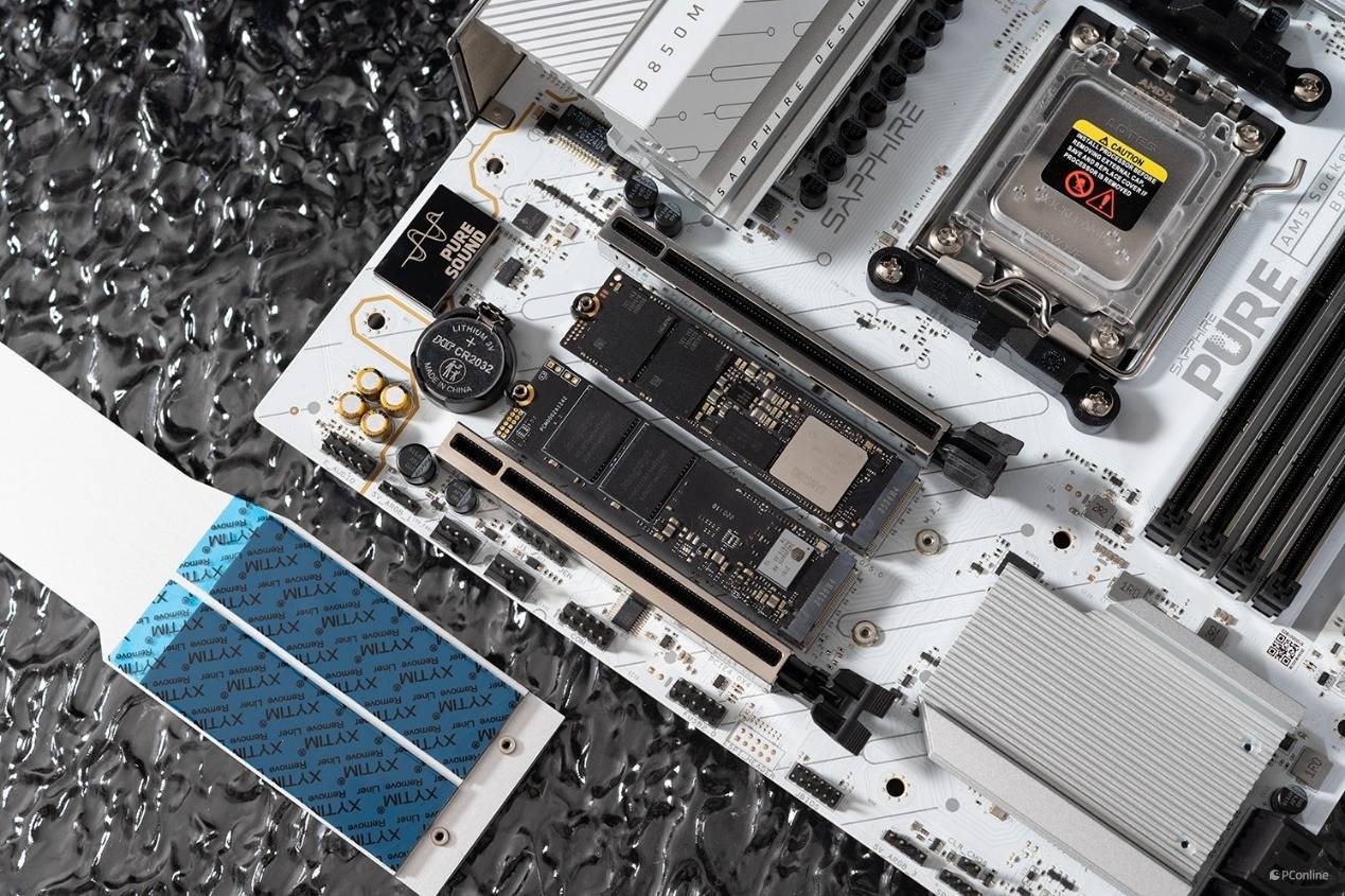 蓝宝石PURE极地B850A WIFI主板共有三个M.2固态硬盘位,其中靠近CPU底座的一组为PCIe 5.0×4标准,剩下的两组则是PCIe 4.0×4标准。