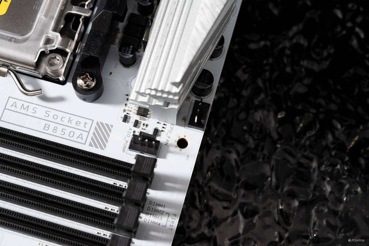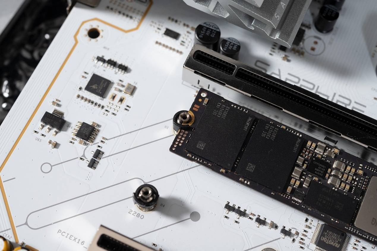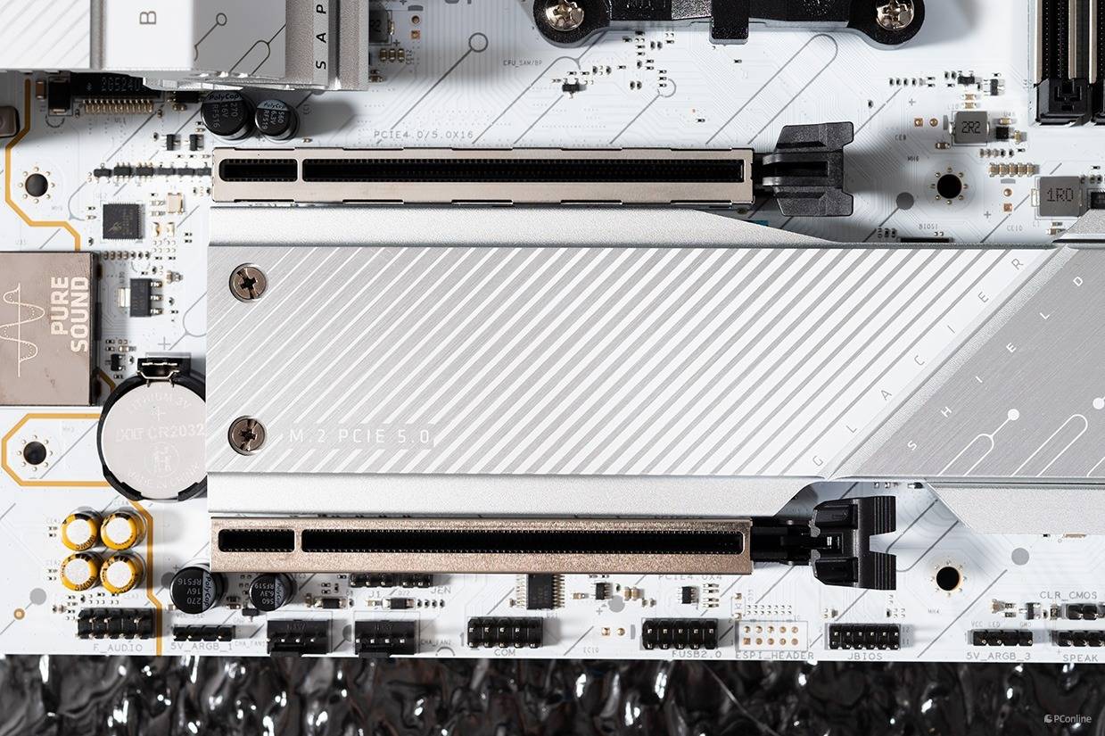 蓝宝石PURE极地B850A WIFI主板共有三个M.2固态硬盘位,其中靠近CPU底座的一组为PCIe 5.0×4标准,剩下的两组则是PCIe 4.0×4标准。
