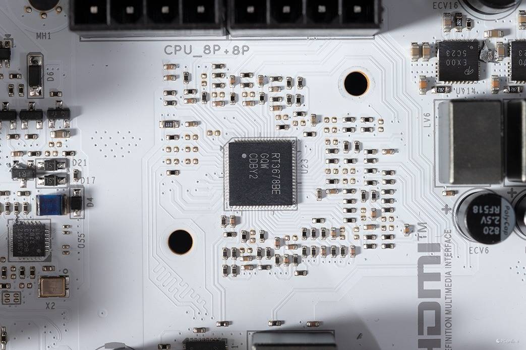 至于CPU与核显的PWM芯片则是RT3678E,这是一款8 + 2相的控制器,来自立锜科技。