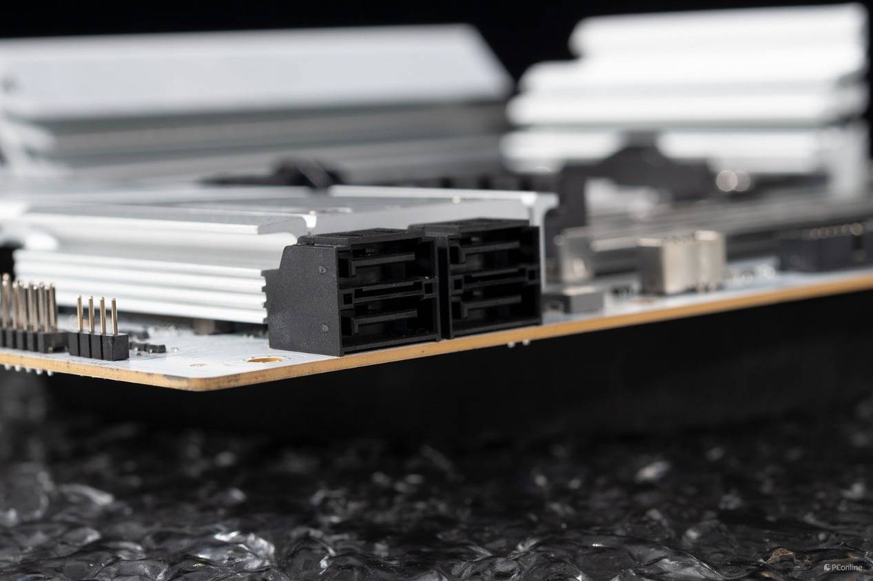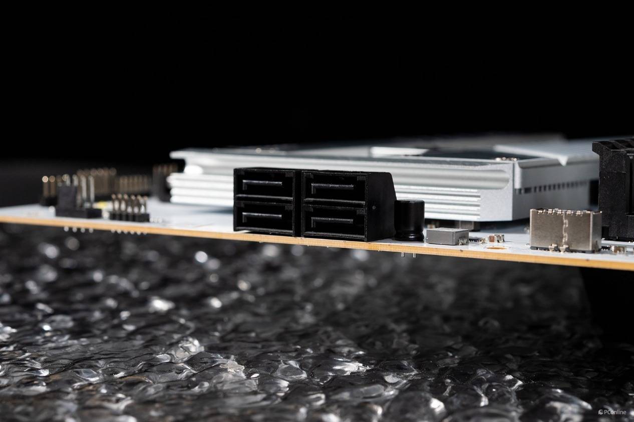 另外,主板侧边还有4个SATA接口,兼容旧的存储设备接口,包括机械硬盘,以及光驱产品等,最高支持6Gbps的传输速度。