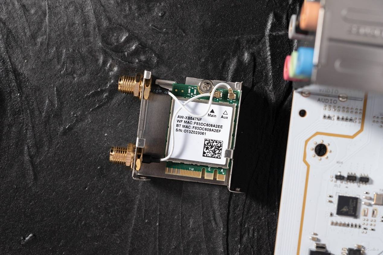拆开挡板还可以看到其无线网卡配置,是来自Realtek瑞昱的RTL8852BE无线组网方案(型号AW-XB547NF),具备2T2R MIMO功能,提供高达1200Mbps的最高速度,并且支持WiFi6传输速率以及蓝牙5无线传输技术。