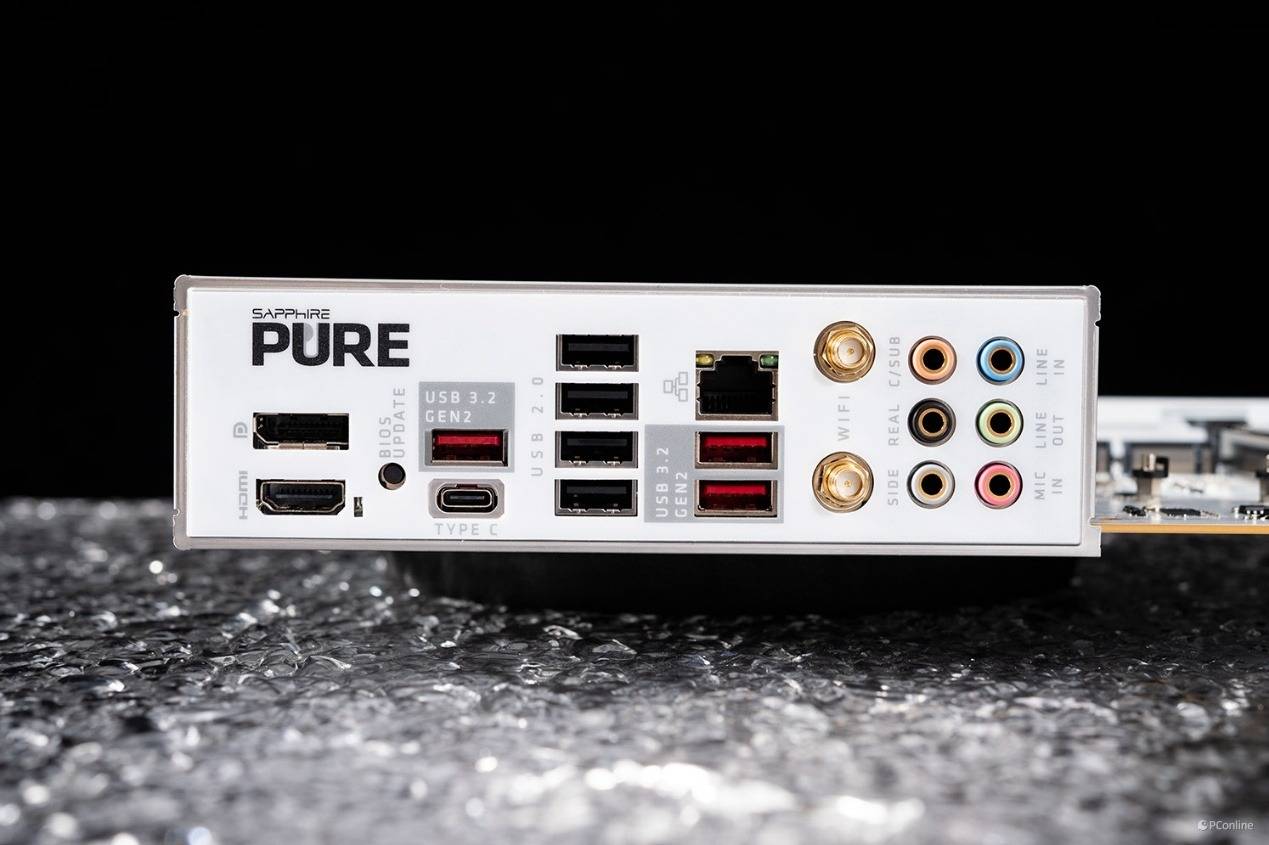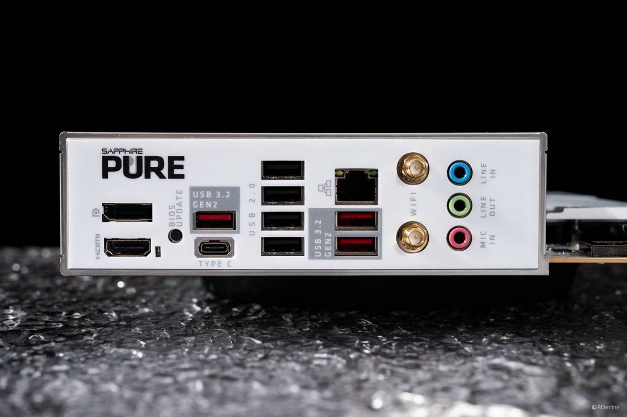 最后我们再来看看蓝宝石PURE极地B850A WIFI主板的后置IO接口,不得不说配置还是非常丰富的,从上到下依次是1个DP,1个HDMI,4个USB 2.0接口,3个USB 3.2 Gen 2接口、1个USB 3.2 Type-C Gen 2接口;此外还包括1个2.5G有线网口、Wi-Fi 6天线接口以及声道音频接口。这款主板后置还有一个UPDATE BIOS按钮,以及前置提供Clear BIOS按钮和DEBUG指示灯,实用性拉满。