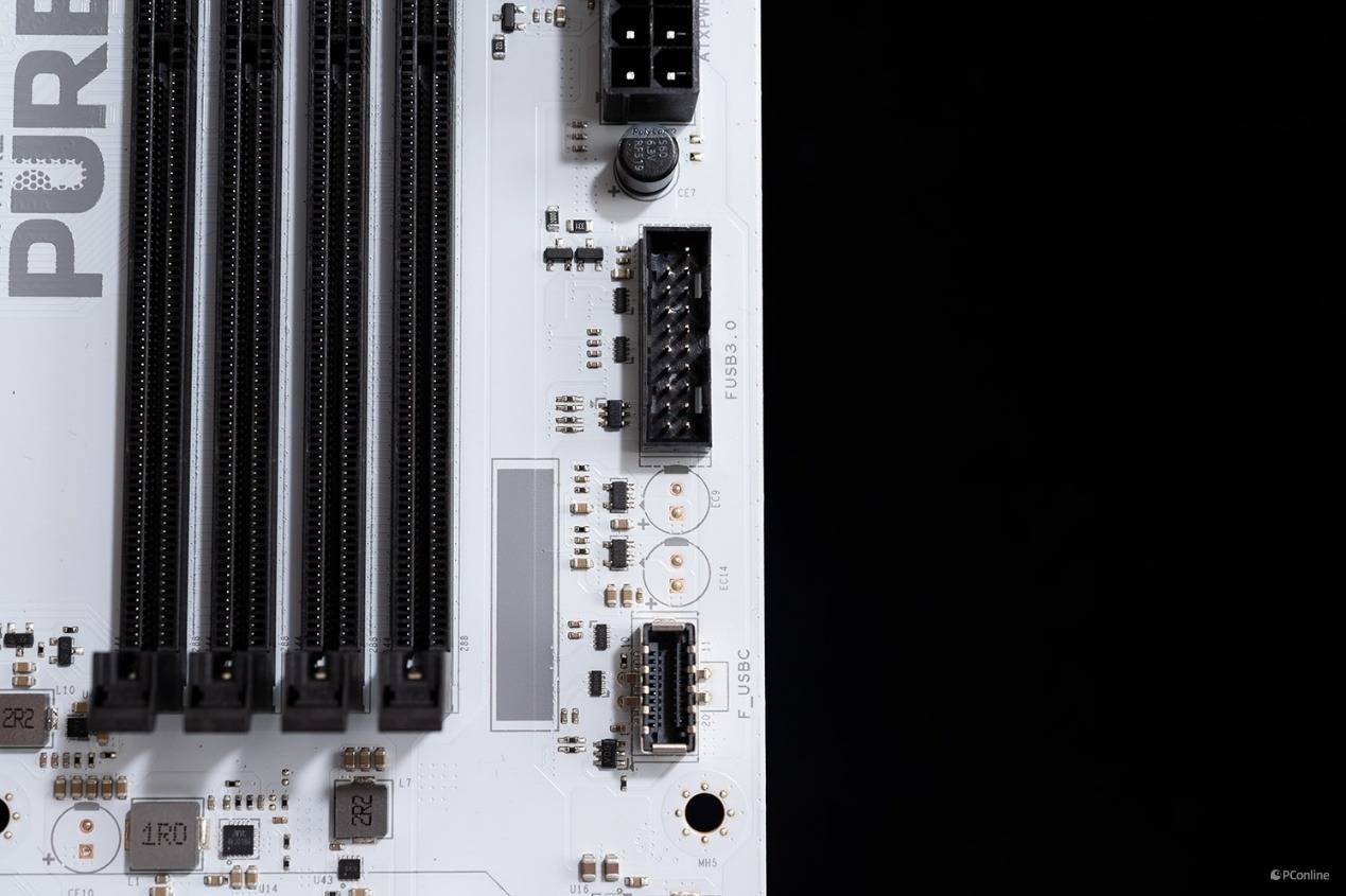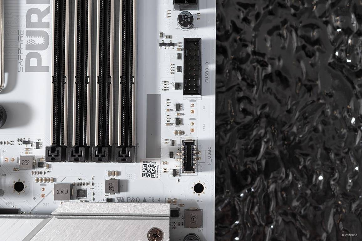 蓝宝石PURE极地B850A WIFI主板也提供了丰富的扩展接口,主板旁边有USB前置拓展接针,可以扩展出2个USB 3.2 Gen 1 5Gbps(Type-A)接口以及1个前置USB 3.2 Gen 1 5Gbps (Type-C)接口,这个配置基本能够满足玩家的扩展需求。