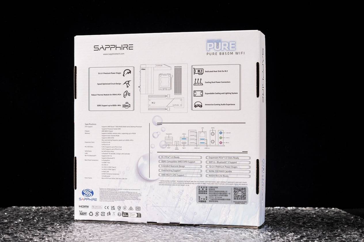 外包装的左侧详细的标注了这款主板的型号——PURE B850M WIFI。