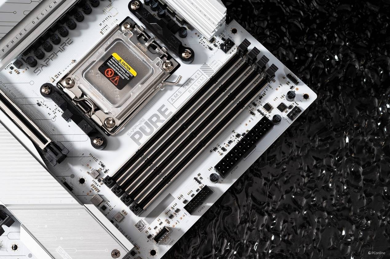 内存插槽方面,蓝宝石PURE极地B850M WIFI配备了4条DDR5 DIMM内存插槽,最大可支持192GB容量内存,支持最高DDR5-8000高频内存,当然AMD独家的AMD EXPO内存超频技术也一并支持。