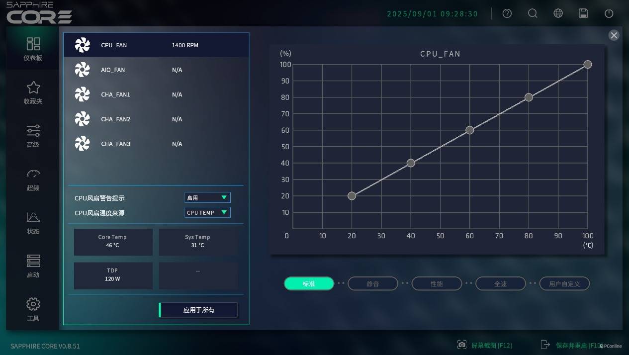 风扇控制页面也进行了优化,对于不想折腾的用户,Sapphire Core内置了四档风扇转速预设;这些预设均是通过收集众多玩家的反馈,结合反馈优化过后的风扇曲线。当然,爱折腾的玩家也可以自定义风扇曲线,满足各项需求。