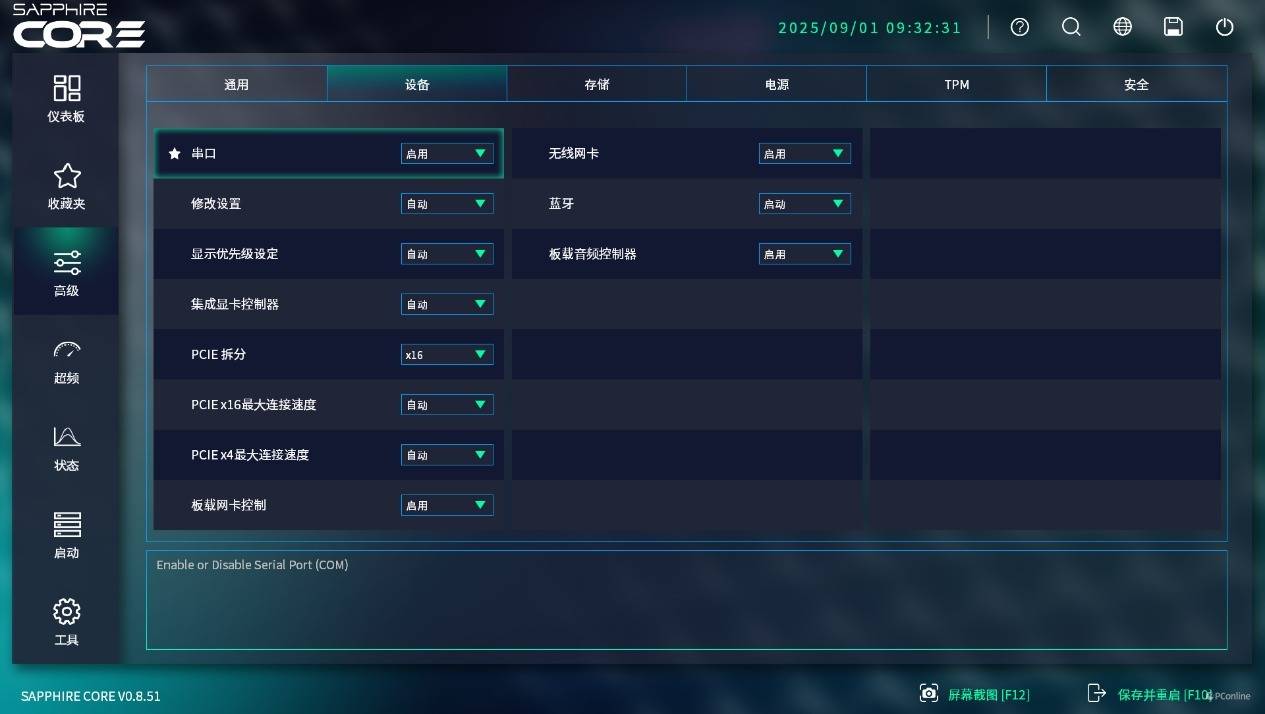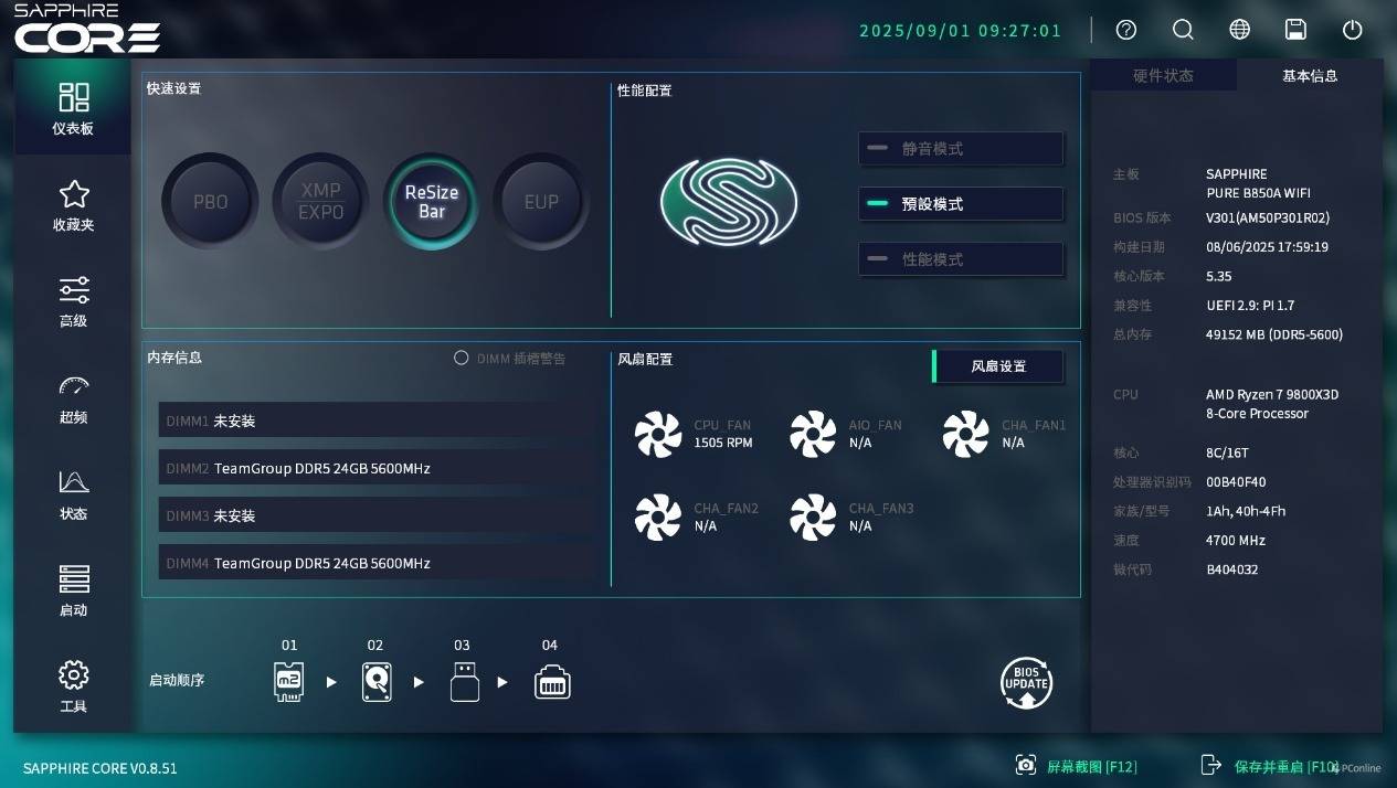 此次蓝宝石除了带来全新的PURE系列B850主板外,BIOS页面也进行了全新升级!新BIOS采用了现代化的扁平UI设计,页面相比之前更简洁直观,同时操作也更简单上手,无论是小白还是资深玩家都能上手即用。例如:进入BIOS后,常用的快捷功能以及性能模式都可以快速选择。