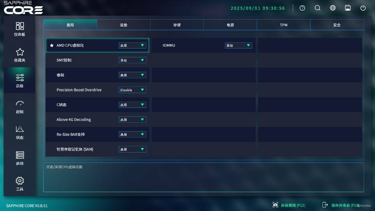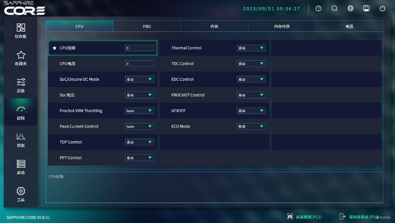 超频页面就更丰富了,这里能够调整的选项涵盖了CPU、内存以及电压,并且蓝宝石还很细节的将每个超频类目都进行了详细的分类,例如你想调整CPU超频,那么所有CPU超频的选项将在该栏目下方,无需去其他层级寻找相关选项。