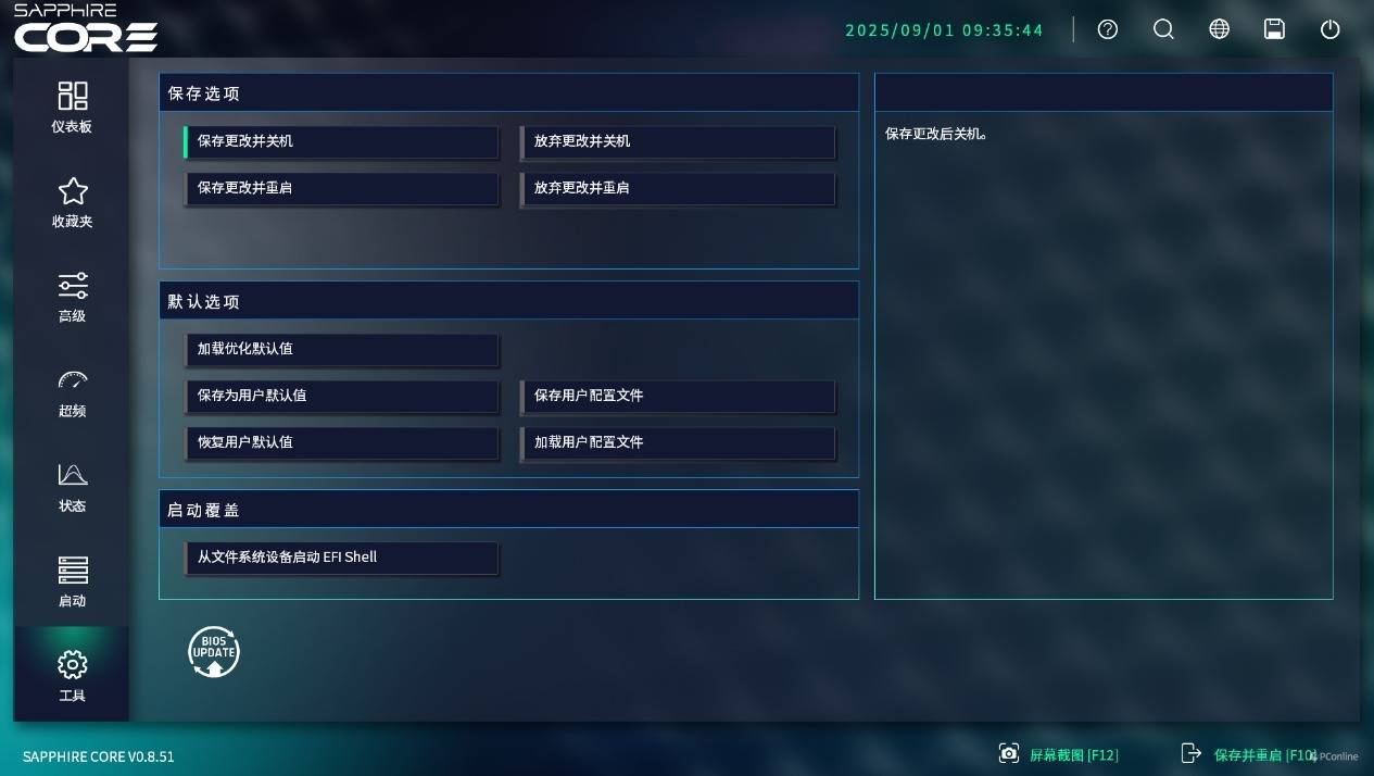 至于最后一项工具选项,这里也提供了不少实用功能,例如BIOS直接关机功能,玩家可以在设置完项目后直接关机,这一点对于装机员/网管还是非常实用的,节省了很多时间。另外这里还有配置分享功能,玩家可以互相“抄作业”,小白也能分分钟体验大神的超频乐趣。