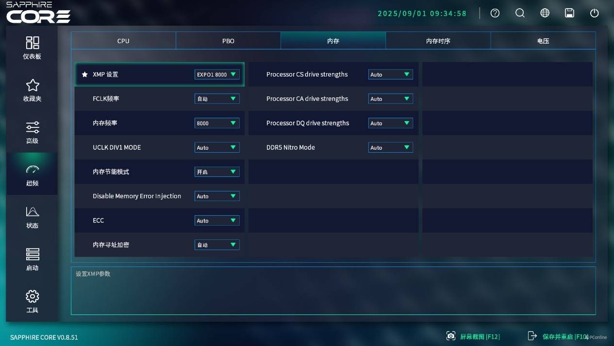 如果你想超频内存,也能够在内存部分找到全部的超频选项,并且在调整时序界面,还能看到蓝宝石开放了开放了第一、第二以及第三时序,即内存的所有时序,仅一页便可展示所有的内存时序。无需像传统BIOS一样,通过下拉的方式去寻找的方式去调整时序参数。
