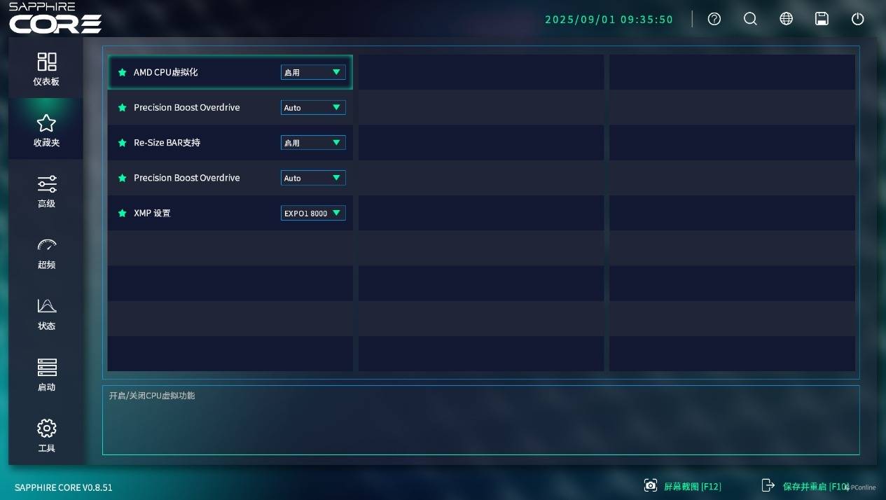 并且现在蓝宝石主板的BIOS也更新了收藏夹功能,单击收藏后,即可在《收藏夹》中即可展示所有收藏过的项目,方便极客大家超频或联动调整。