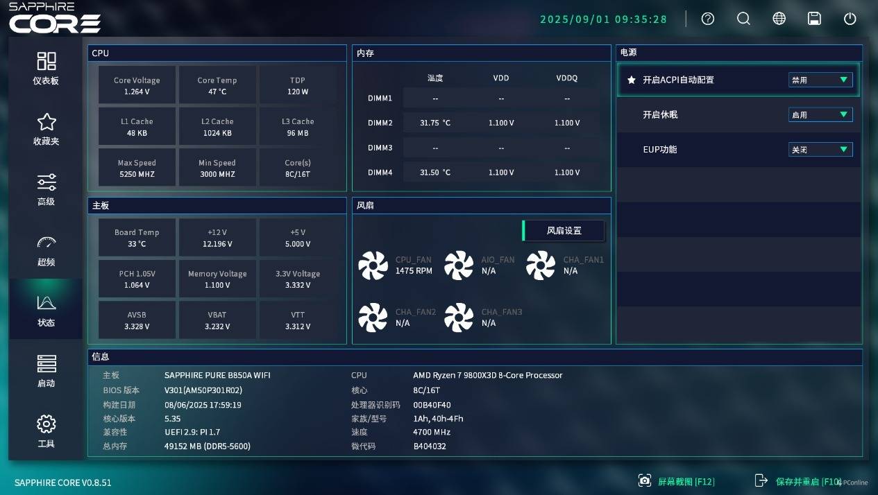 状态页面则专注于目前硬件的参数显示,该页面可以详细的看到CPU、内存、风扇、电压、温度等信息,让各位玩家对自己的PC有个全面的了解。