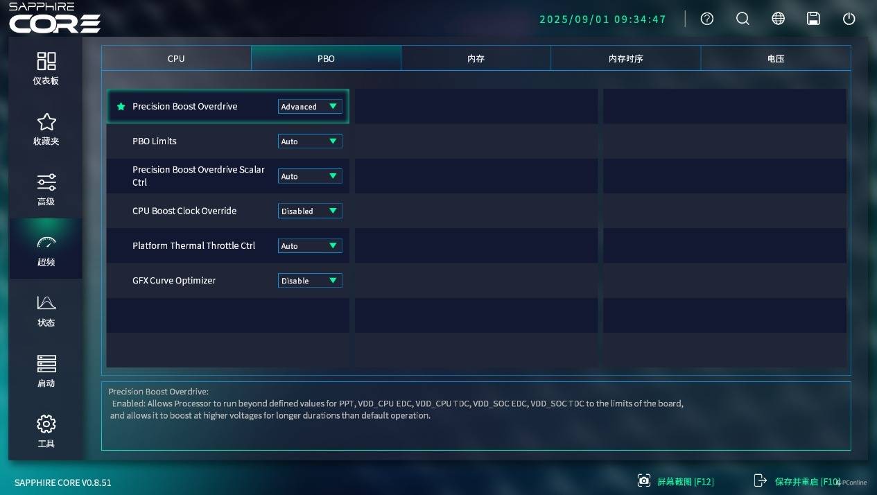 PBO选项也给了很多选择,如果是小白用户,可以选择Auto或者Enable选项即可,而极客玩家则可以开启Advanced选项去进行精细化的调整。