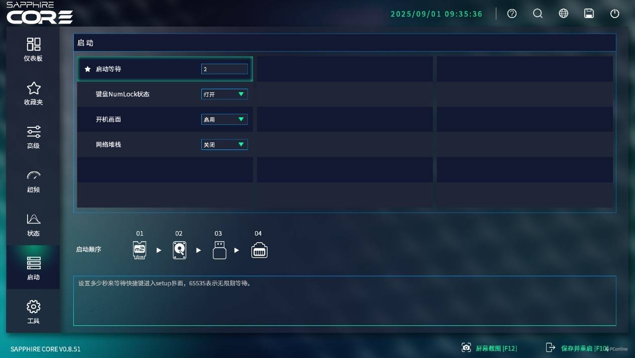 启动页面则主要用于调整硬盘的开启顺序,并且蓝宝石给每个选项都安排了LOGO标识,玩家可以更直观的看懂目前的启动项。