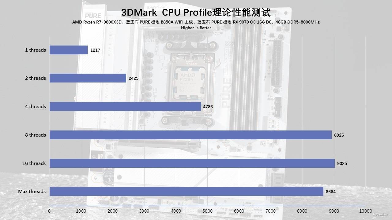 3DMark CPU Profile我们也进行了测试,这项测试可以更精准的测试CPU在单核与多核方面的性能表现,实测这两块主板完全能够带动9800X3D,其单线程分数为1217,最大线程分数为8664,表现不错,作为一款专为游戏而生的CPU,这个成绩已经完全能够满足主流用户的需求了。