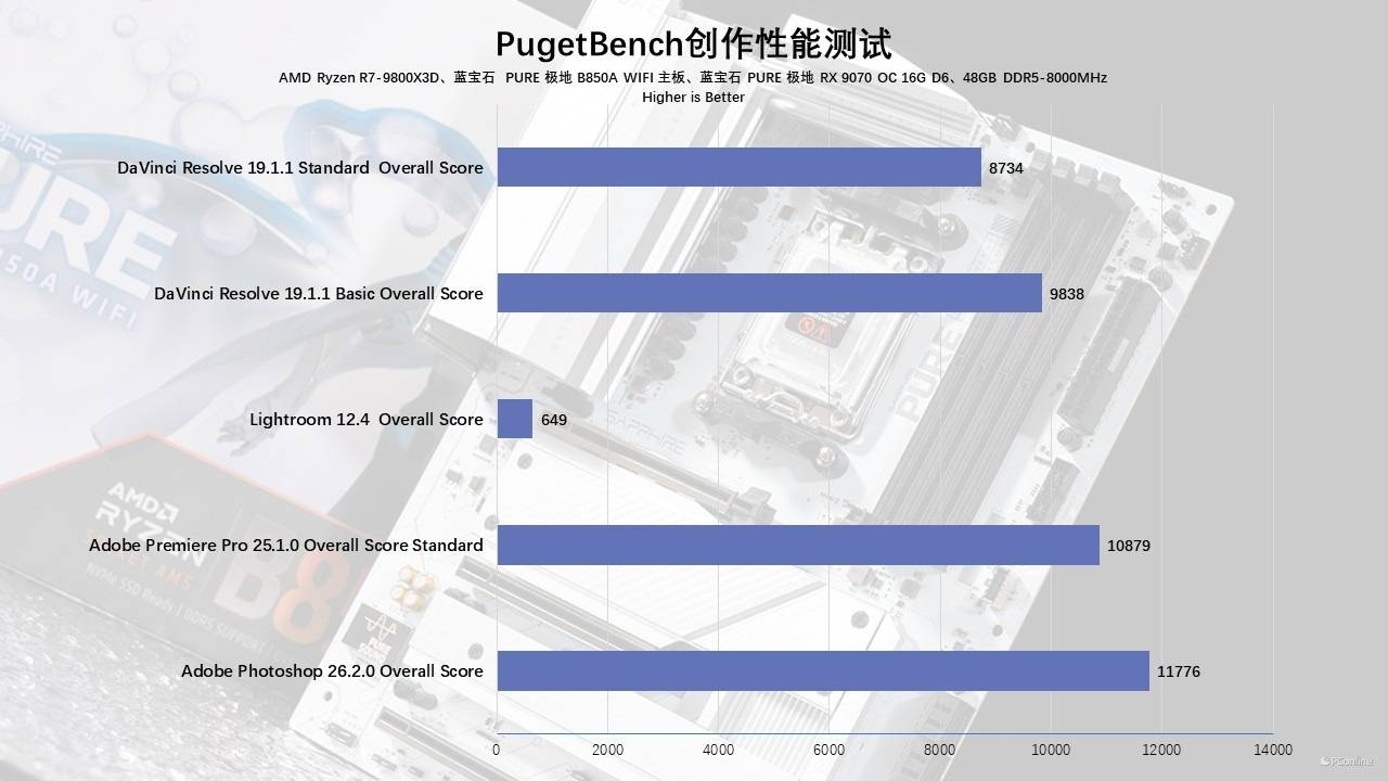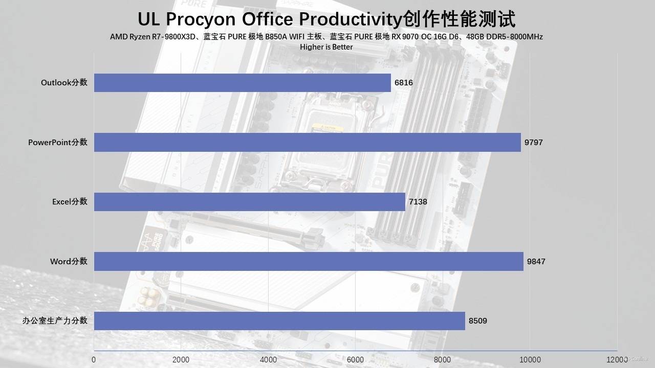 接下来是创作性能方面的测试,首先来点简单的,在UL Procyon的办公软件测试中,以蓝宝石PURE极地B850A WIFI与蓝宝石PURE极地B850M WIFI+蓝宝石PURE极地AMD RADEON RX 9070搭建的平台,表现可以说优异了。测试总分为8509,其中Word得分9847,Excel得分7138,PPT得分9797,Outlook得分6816。