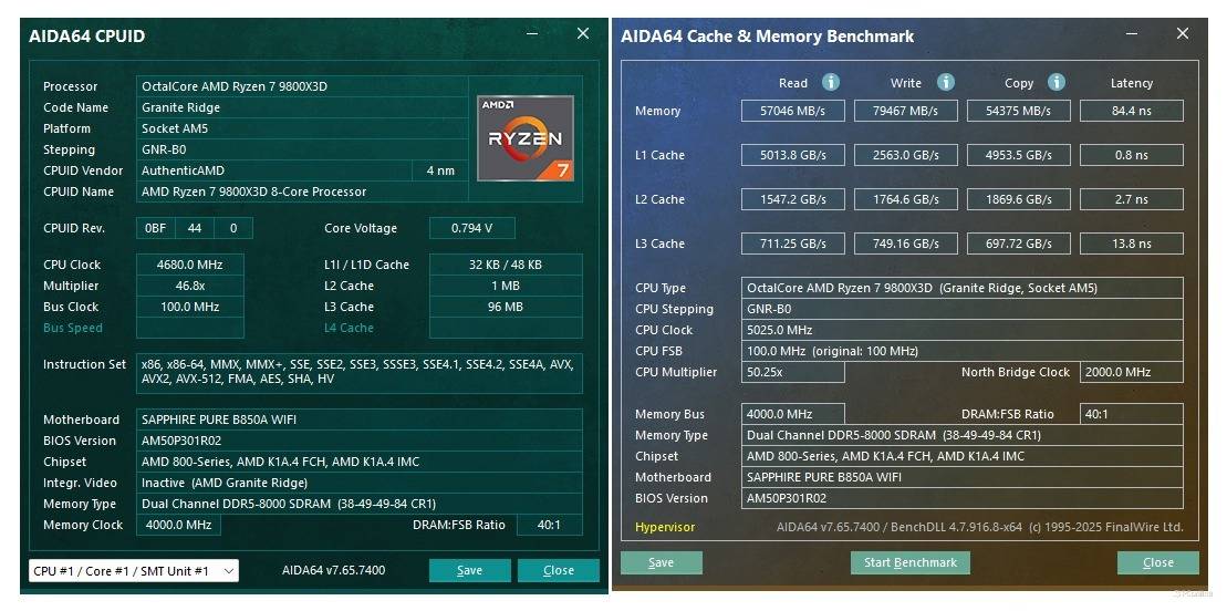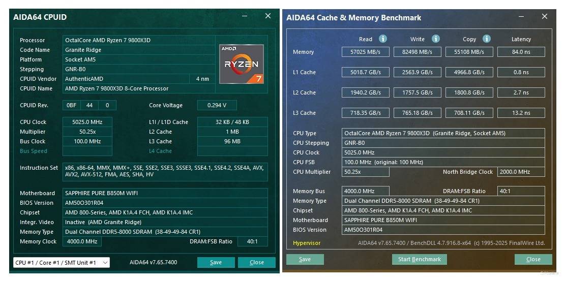 另一块蓝宝石PURE极地B850M WIFI主板的表现也非常给力,8000MHz同样轻松达成,读取速度达57025MB/s,写入速度达82498MB/s,复制速度达55108MB/s,延迟则是84ns。