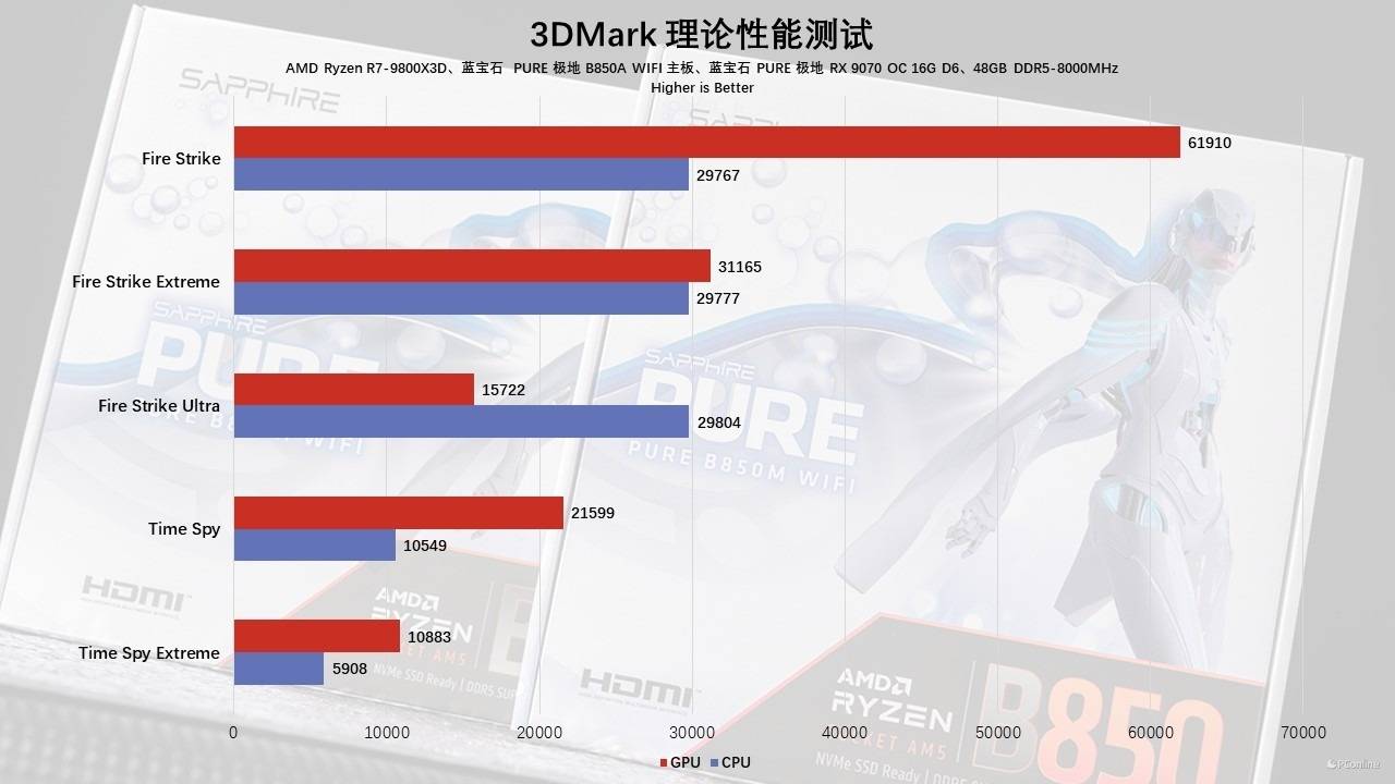 紧接着我们还测试了3DMark的理论性能,实测9800X3D无论是在DX11的Fire Strike项目,还是DX12的Time Spy项目,成绩均相当优秀,特别是在Fire Strike中,9800X3D的成绩逼近3w分,蓝宝石PURE极地B850A WIFI与蓝宝石PURE极地B850M WIFI主板出色的供电配置让这颗游戏神U有了不错的性能释放空间。