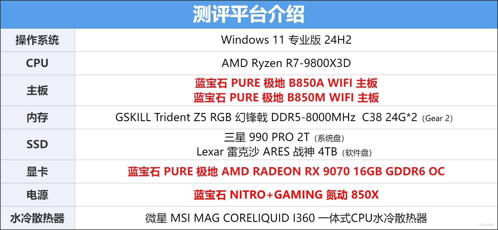 在开始测试前,给大伙介绍一下此次的测试平台。其中主板跟处理器分别是蓝宝石PURE极地B850A WIFI主板以及AMD Ryzen 7-9800X3D。