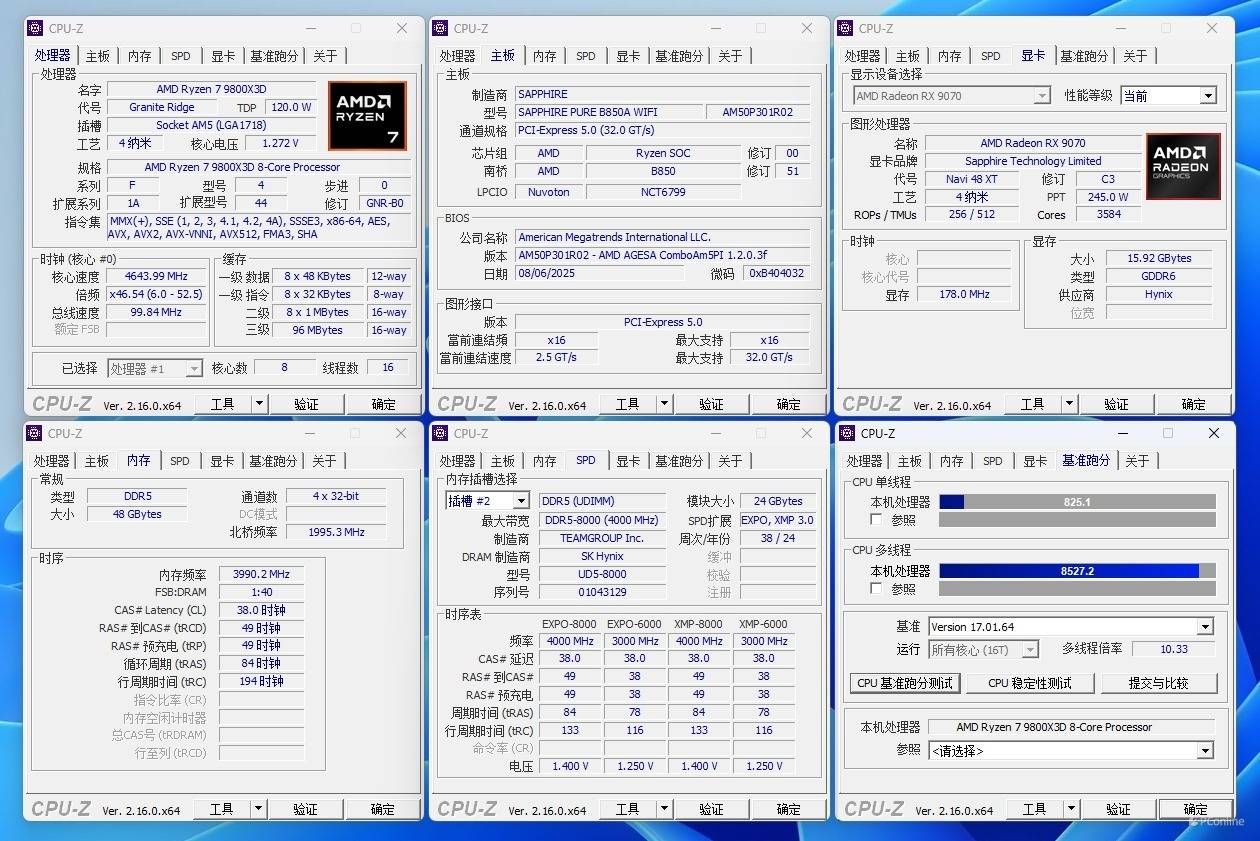 CPU基准测试方面,我们用9800X3D分别在两款主板上进行了测试,实测在蓝宝石PURE极地B850A WIFI主板上,处理器单核得分825.1,多核8527.2;而在蓝宝石PURE极地B850M WIFI上,处理器单核得分826.9,多核得分8492,二者得分均非常出色,完全能够胜任带动9800X3D的重任。