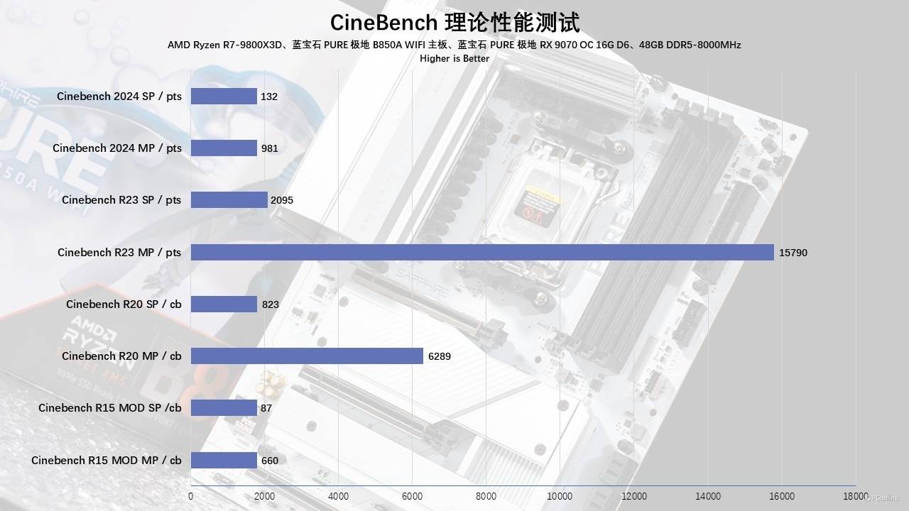 最后我们还测试了大家熟悉的CineBench,进一步看看这颗处理器在两款主板上表现如何,从实测成绩来看,蓝宝石PURE极地B850A WIFI与蓝宝石PURE极地B850M WIFI主板完全可以满血释放这颗9800X3D的真正性能,甚至部分成绩已经能够跟X870主板媲美,整体表现还是可圈可点的。
