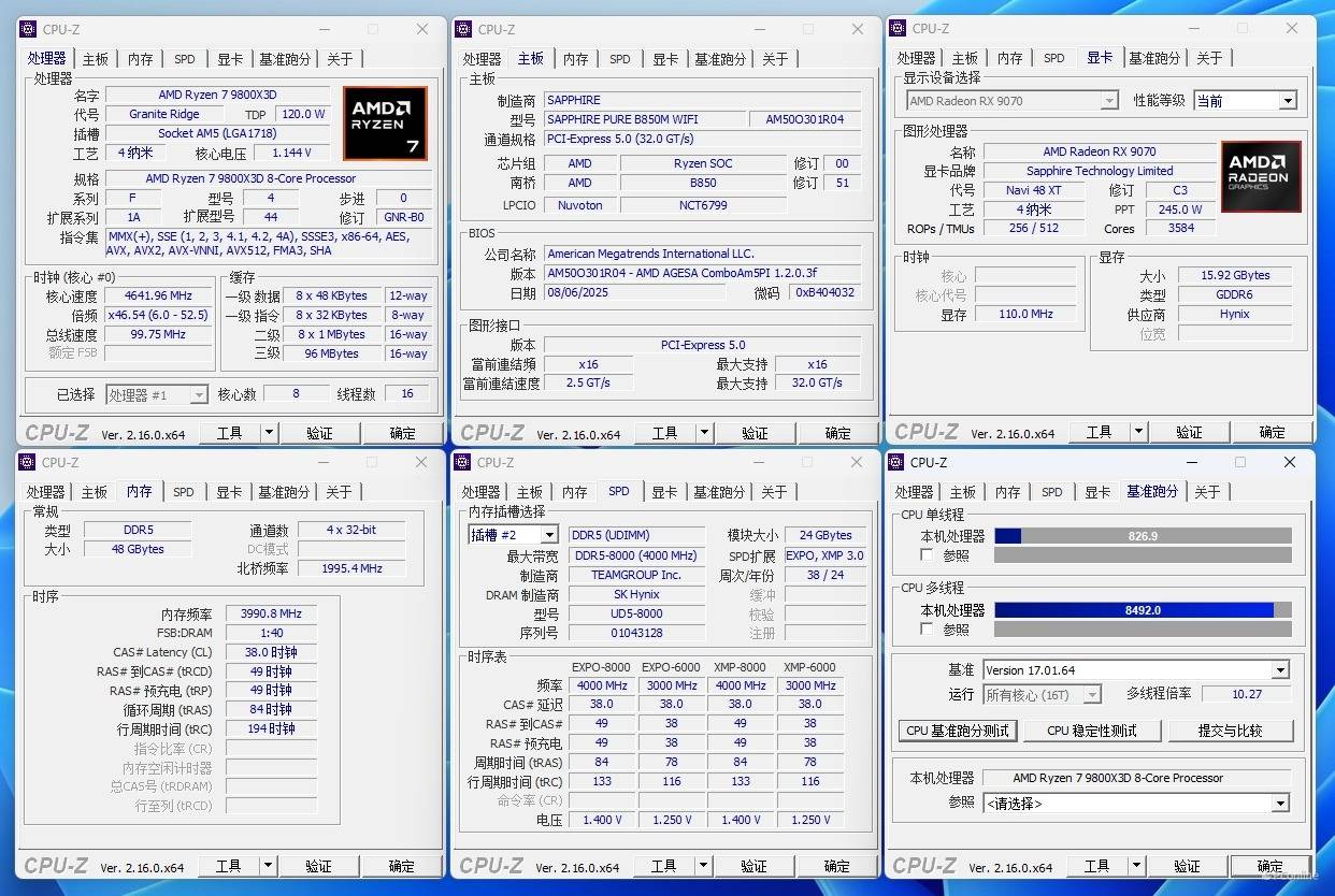 上机后,依照惯例,我们还是先在CPU-Z中看看平台硬件信息,同时也可以对处理器进行一定的性能测试。从下面两张图可以看到,主板分别为上面提到的蓝宝石PURE极地B850A WIFI以及蓝宝石PURE极地B850M WIFI,BIOS版本也为最新,并且也能看到两款主板的图像接口均支持PCIe 5.0×16标准。