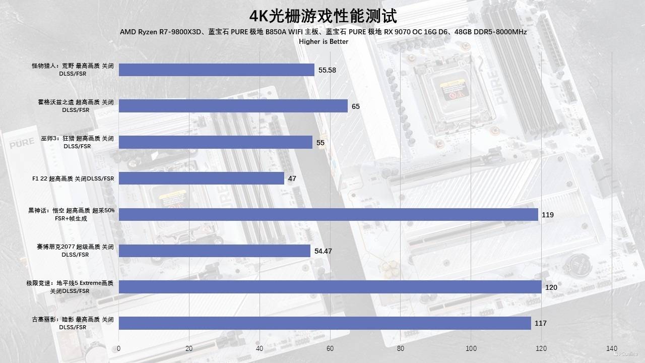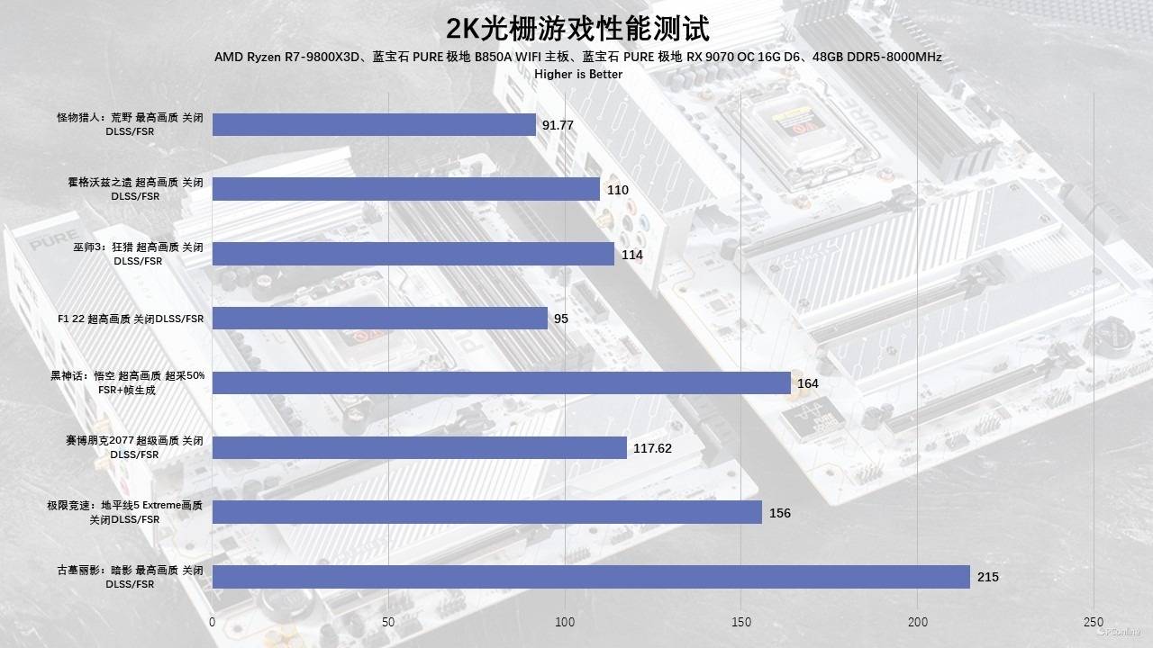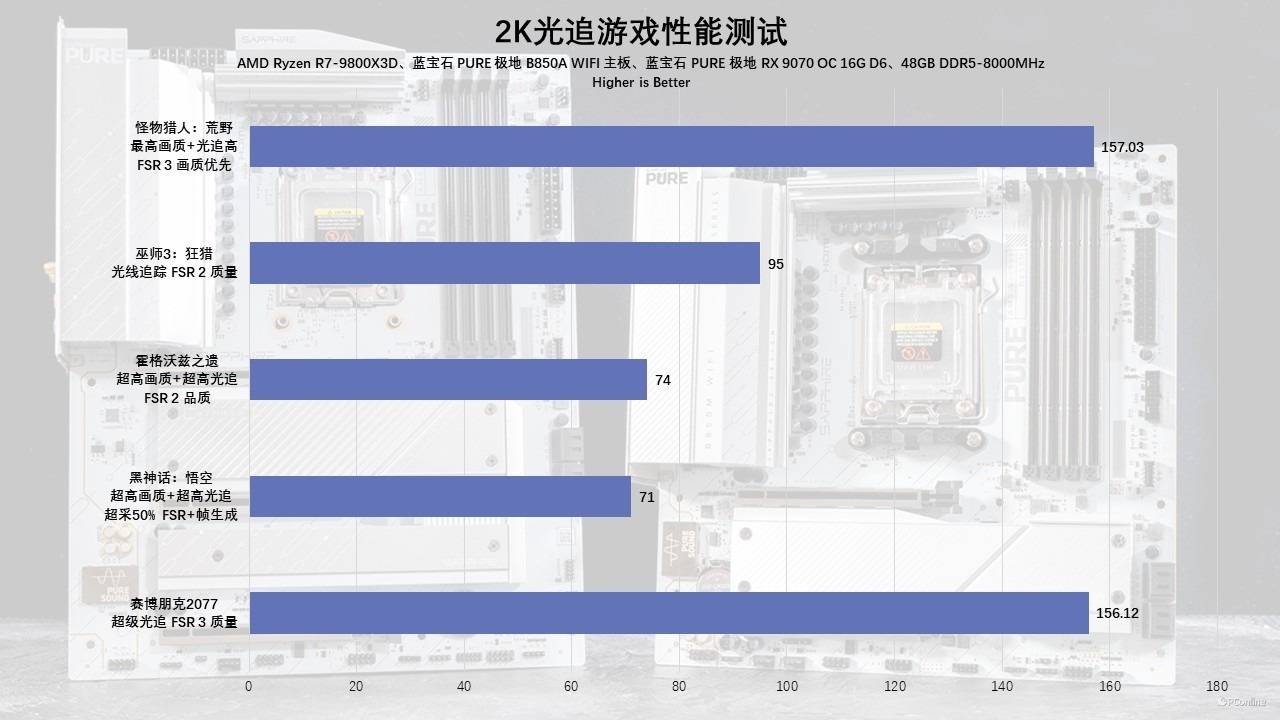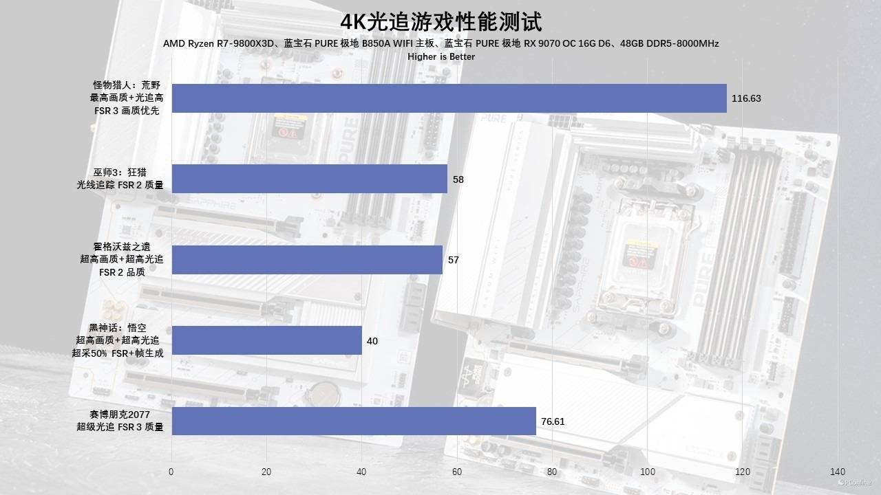 总的来说,游戏玩家完全无需担心3A平台的实力,在我们测试的多款游戏中,9800X3D搭配蓝宝石PURE极地B850A WIFI与蓝宝石PURE极地B850M WIFI主板以及蓝宝石PURE极地AMD RADEON RX 9070 16GB GDDR6 OC显卡,面对各类热门3A大作皆能应对自如,2K分辨率甚至是4K分辨率下,开启光追特效后借助FSR技术也可畅快游玩。