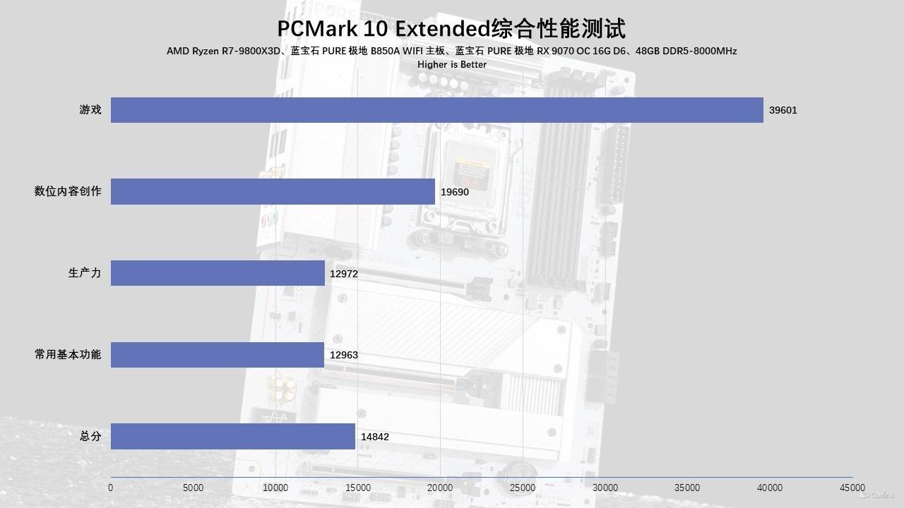日常使用体验使用PCMark 10 Extended项目来进行测试。项目包括常用基本功能、生产力、数位内容创作,以及游戏测试部分,从而全面地评价这套平台的使用体验。实测,蓝宝石PURE极地B850A WIFI与蓝宝石PURE极地B850M WIFI两款主板搭建的3A平台也能够释放不错的实力,如下图所示,测试总分为14842,这个成绩已经追上RTX 5070 Ti了,而各个子项得分如下:常用基本功能得分为12963,生产力方面为12872,数位内容创作为19690,而在游戏性能测试中,得益于蓝宝石PURE极地AMD RADEON RX 9070 16GB GDDR6 OC出色的性能表现,更是达到了39601分。