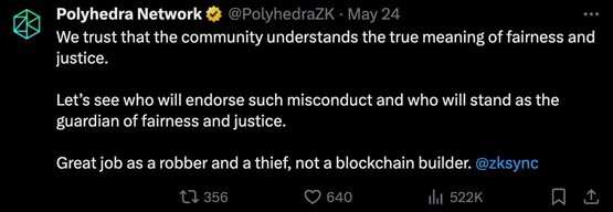 Polyhedra Network 对此表达了强烈不满,他们在社交媒体上发文,指责 zkSync 抢夺他人代码。他们认为,即使在 ETH ETF 获批的背景下,仍然有项目为了自身利益侵占他人成果。Polyhedra 强调,ZK 是他们的项目代码,Web3 不应该成为滋生欺凌的温床。Polyhedra 项目方还呼吁社群坚守公平正义,抵制这种不正当行为,并表示自己将成为公平正义的捍卫者。