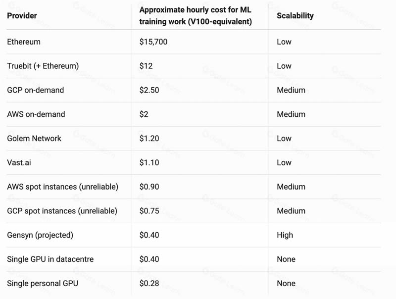 大型企业级用户预算充足,更倾向于选择中心化的算力服务。Gensyn 的用户群体更多的是从事机器学习的小微企业、个人开发者或是科研团队,这类人群对价格较为敏感,难以接受高昂的算力成本。去中心化机器学习的最大优势在于降低用户的成本投入。按照 Gensyn 目前官方公布的成本来看,其价格仅有 0.4 美元/小时,相比较于同等算力的亚马逊云的 2 美元/小时,成本足足下降了 80%。