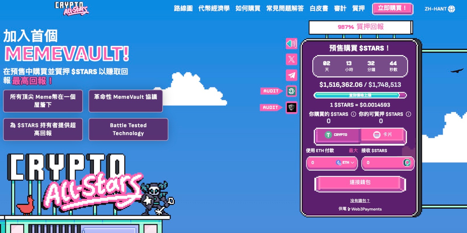另一方面,Crypto All-Stars($STARS)则以其创新的MemeVault系统成为市场上的一大亮点。该平台允许持有多种Meme币的用户将其代币进行质押,并赚取高达1278%的年化收益。该平台支持包括Pepe Coin、Shiba Inu、Dogecoin等在内的多种知名Meme币,并采用ERC-1155标准,允许将来加入更多的新Meme币。自预售开始以来,该平台已经筹集了超过150万美元,预计未来将吸引更多的投资者。