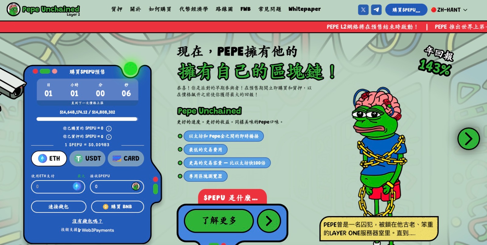 Pepe Unchained是一款基于Layer 2技术的Meme币项目,旨在突破其前身Pepe Coin的限制。与基于以太坊的Pepe Coin不同,Pepe Unchained利用Layer 2技术,提供了更快、更便宜且更具扩展性的交易环境。这使得Pepe Unchained不仅拥有Pepe的经典形象,还拥有更强大的技术基础,被誉为「Pepe杀手」。