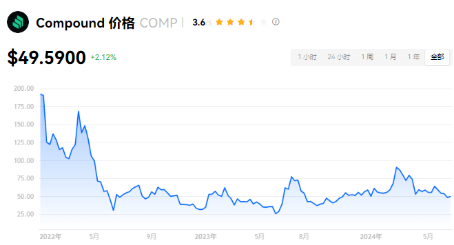 Compound 当前价格为 $49.5900。Compound 的价格在过去 24 小时内上涨了 +2.12%。目前,Compound 市值排名为第 106 名,实时市值为 $3.41亿,流通供应量为 6,856,086 COMP,最大供应量为 10,000,000 COMP。我们会实时更新 Compound/USD 的价格。#### Compound 价格表现 (美元)