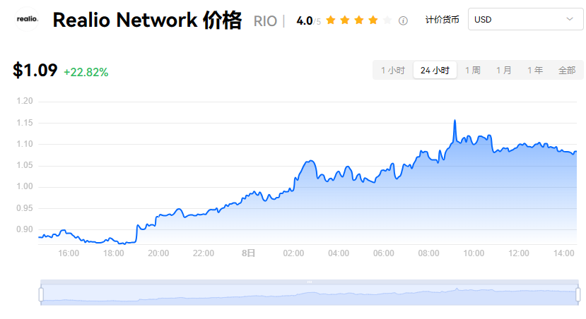 24 小时最低/最高价24 小时最低$0.85最新价格 $1.0924 小时最高$1.19热度排行82市值排行220市值$6,011.11万添加自选人数 (百分比)0.98%历史最高价$8.88-87.80%(-$7.79)2020年9月16日(4 年前)历史最低价$0.014+8,108.69%(+$1.08)2022年10月13日(2 年前)首次发行时间2020/09/16首次发行价$0.40流通总量5,551.45万 RIO流通市值$6,011.11万