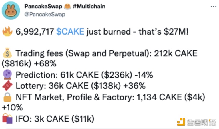 去中心化交易所PancakeSwap发布消息称,他们今日已经销毁了6,992,717枚CAKE,约合2700万美元的价值。这次销毁行动旨在减少CAKE的总供应量,从而提升其稀缺性和价值。