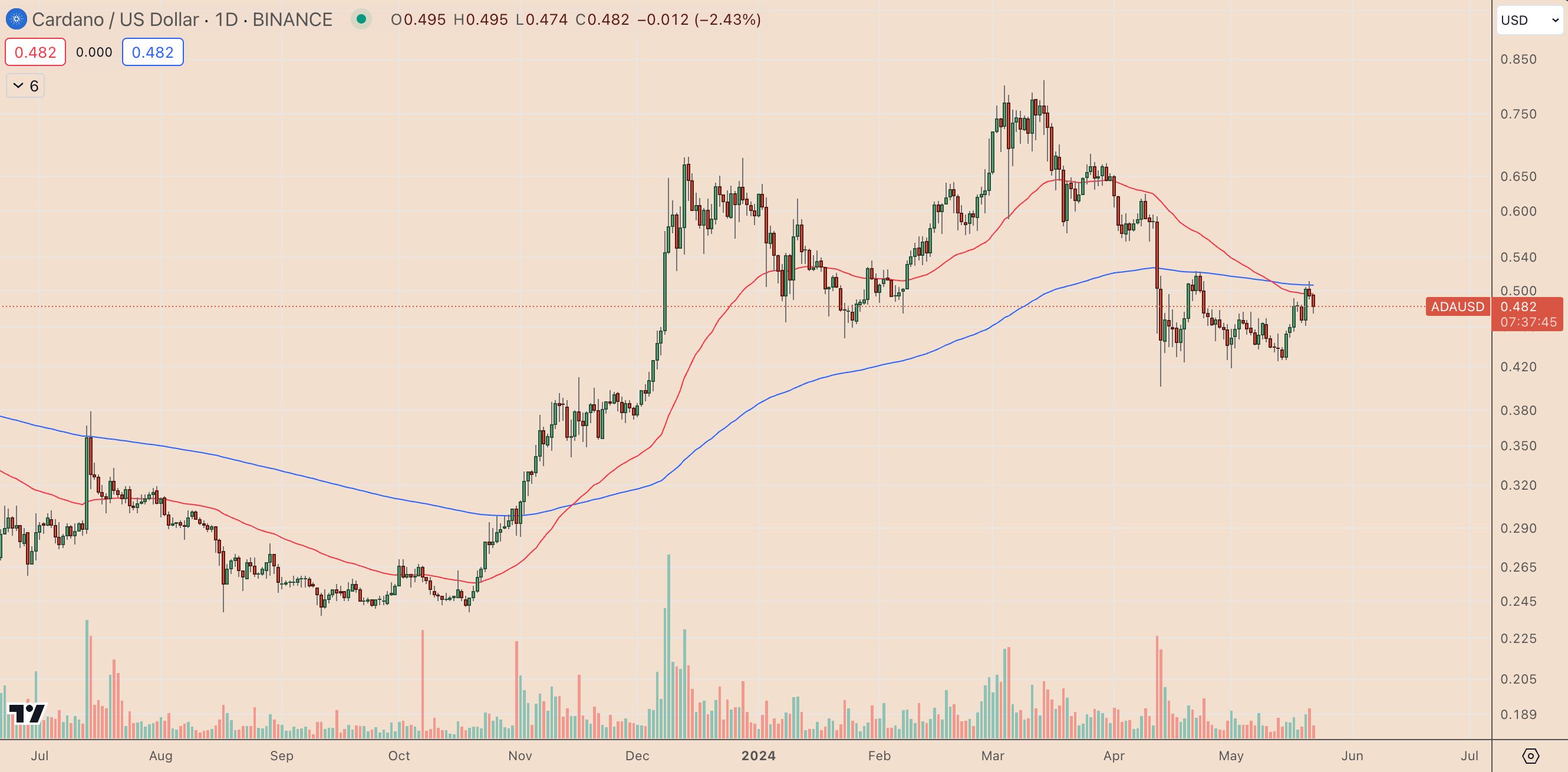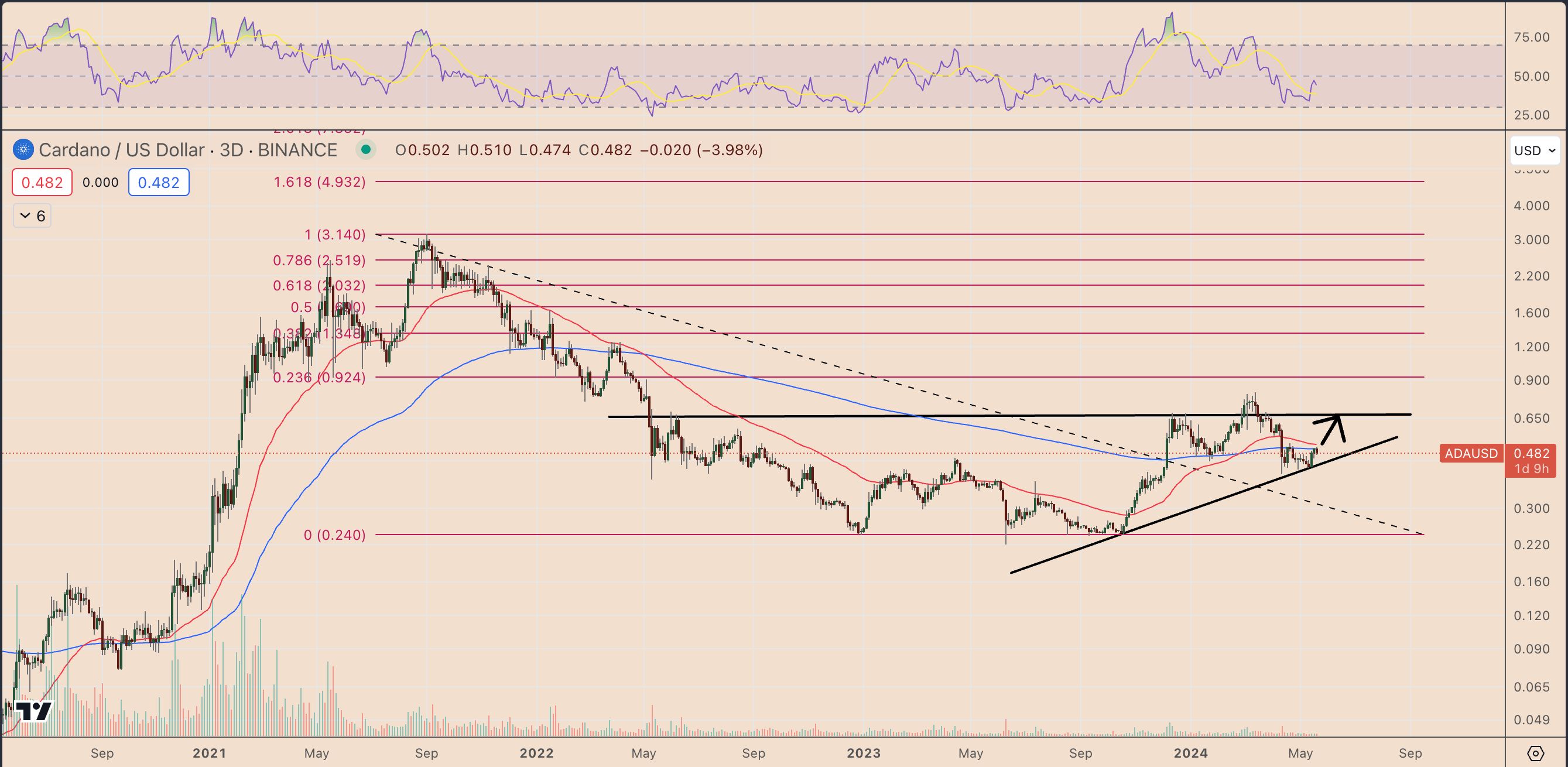 不过,ADA的价格在测试了数月的上升趋势线支撑后也在反弹。如果价格突破50-3D(红色波浪)和200-3D(蓝色波浪)指数移动平均线(EMA),则可能出现更广泛的反弹。在这种情况下,ADA的初始上涨目标将约为0.67美元,较当前价格水平上涨约35%。0.67美元水平是2023年12月和2022年5月的阻力位。