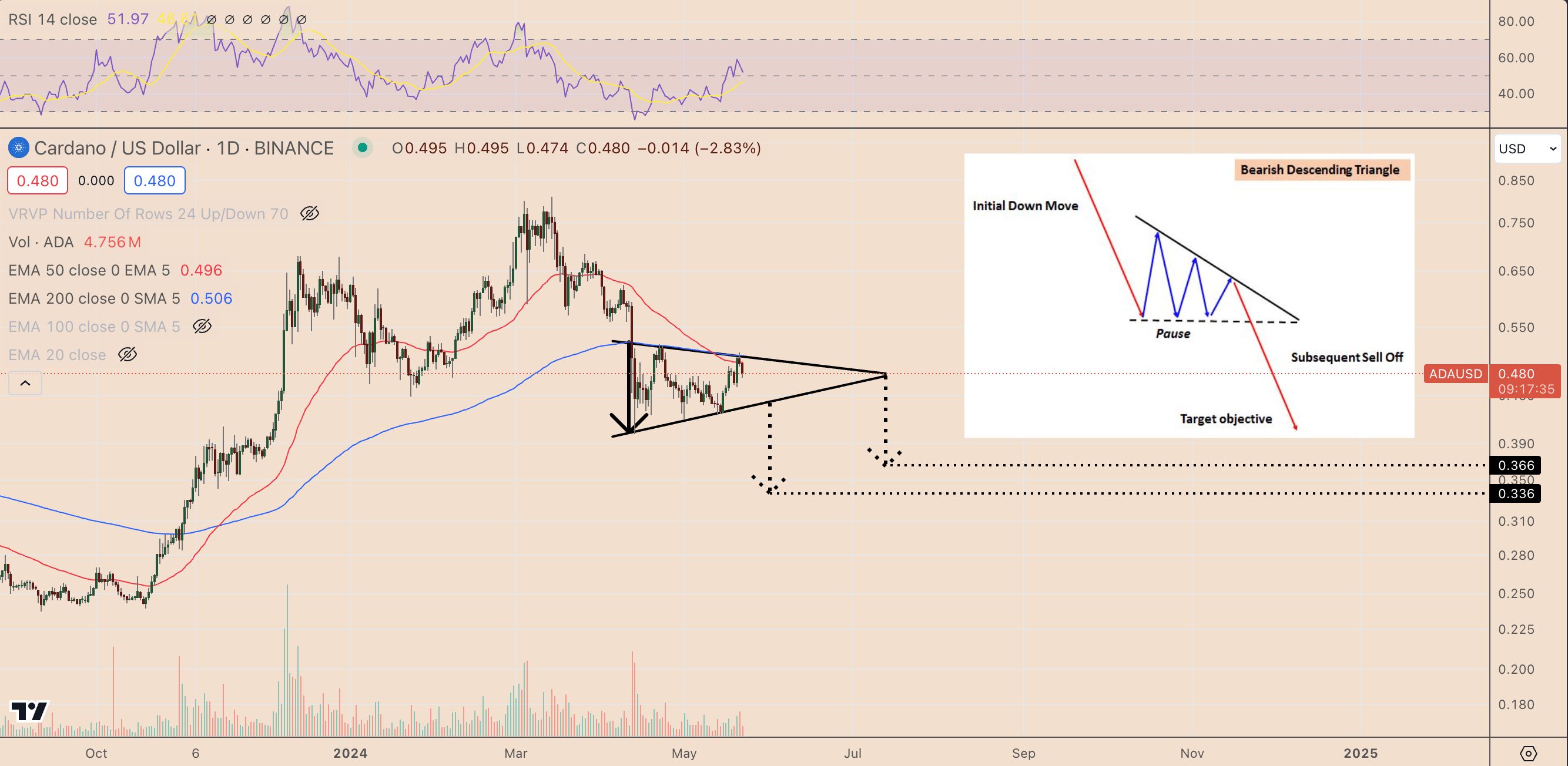 从技术分析的角度来看,卡尔达诺的价格走势似乎也支持这种下跌趋势。卡尔达诺在触及一个熟悉的下降趋势线阻力后,进一步进行了调整。这个阻力是普遍的对称三角形模式的一部分。对称三角形在下行趋势中被视为看跌延续模式,特征是形成两条汇聚的趋势线:一条上升,一条下降。当价格跌破下趋势线并跌至三角形最大高度时,该模式就会消失。