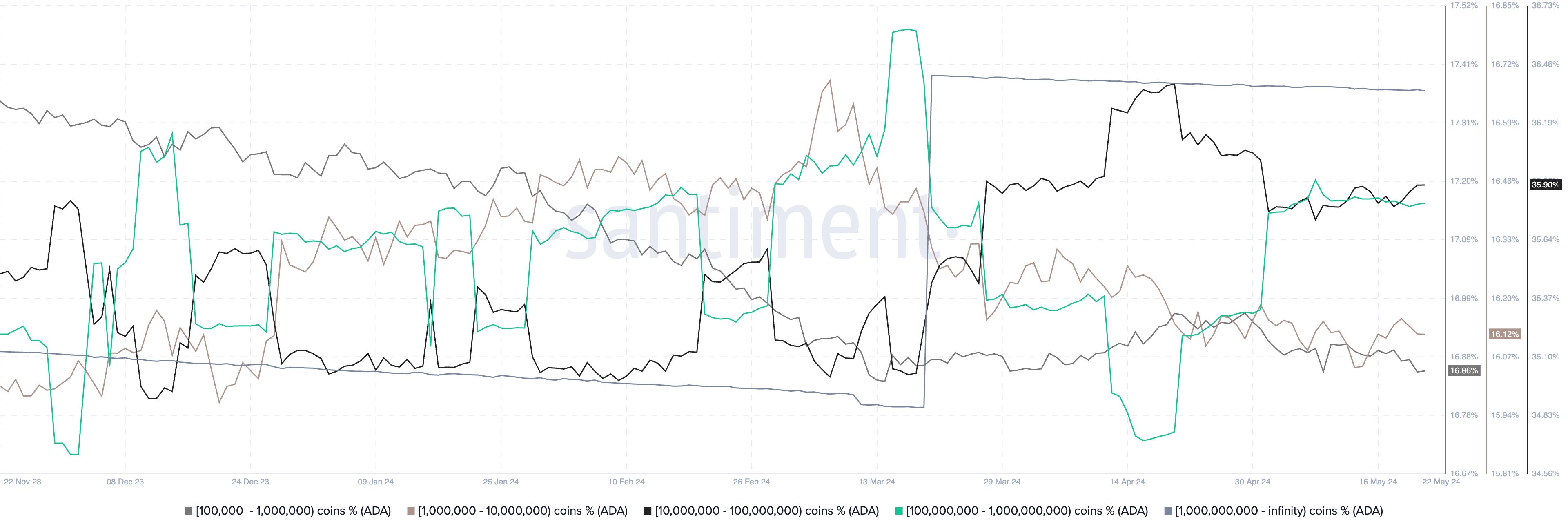值得注意的是,卡尔达诺持续的价格调整恰逢其最富有地址持有的ADA供应量略有上升,这表明这些鲸鱼忽视了Bons对卡尔达诺所谓中心化的警告。例如,持有1000万至1亿ADA(黑色)和1亿至10亿ADA(青色)代币的实体在过去24小时内增持了其持股量。这一趋势表明,大多数鲸鱼都在趁价格下跌时买入,以期进一步上涨。从总体上看,1000万-1亿人群中ADA持有量在3月底左右急剧增加,随后出现一定程度的稳定。与此同时,1亿至10亿人群稳步增加,从3月中旬开始尤其明显。在此期间,ADA的价格下跌了20%以上,这表明大多数卡尔达诺鲸鱼预计长期来看价格会进一步上涨。