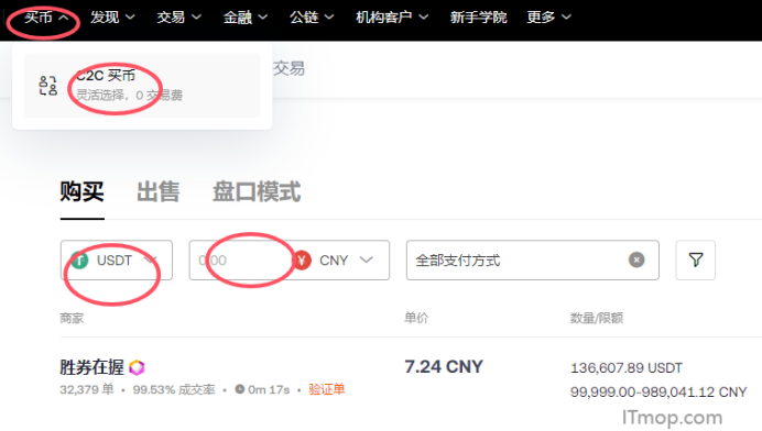 2. 在主页面上,点击“买币”,然后选择“C2C买币”,接着选择你想要的法币进行交易。