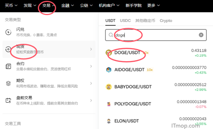 3. 接下来,点击“交易”中的“现货”,在搜索栏中输入“doge(狗狗币)”,然后选择合适的交易对进行交易。