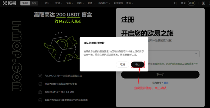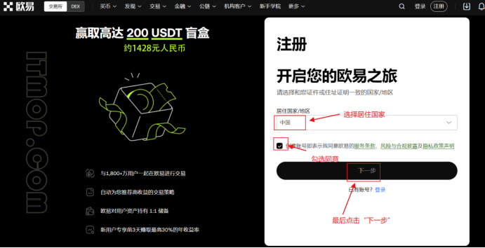 1. 进入欧意交易所的官网,点击注册按钮,并选择你的国家或地区。