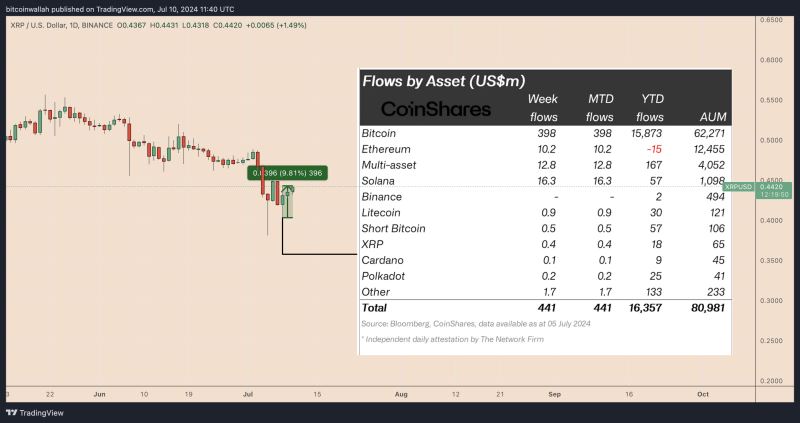 XRP的上涨是自7月8日开始的更广泛市场复苏的一部分。在那之前的一周,加密货币市场整体下跌了11.28%,然而根据资产管理平台CoinShares的报告,这一周加密货币基金却流入了4.41亿美元的资金。特别是,专注于XRP的投资基金在7月5日的一周内吸引了40万美元的资金。自从7月8日发布报告以来,XRP/USD对已经上涨了近10%。