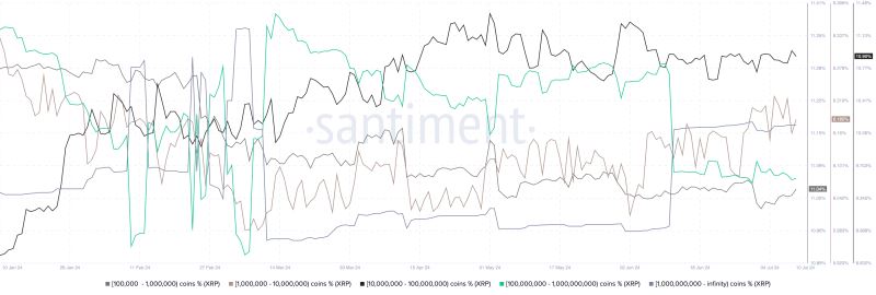 XRP的上涨还与其最富有的投资者群体之一的持有量略有增加相吻合。在过去24小时内,持有1亿至10亿枚代币的实体增加了其持有的XRP供应量,而持有1000万至1亿枚代币的实体则减少了其持有的XRP供应量。同时,持有超过10亿代币的地址的供应量保持不变。这表明,较低群组中的实体正在积累XRP以进入较高群组,显示出大型市场参与者的信心和投资不断增加。